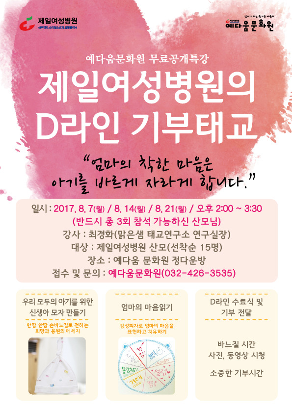 예다움문화원 무료공개특강 '제일여성병원의 D라인 기부태교' 작성자제일여성병원|작성시간17.06.29|조회수11 목록 댓글 0 글자크기 작게가 글자크기 크게가 다음검색 현재 게시글 추가 기능 열기 북마크 공유하기 신고 센터로 신고 댓글 댓글 0 댓글쓰기 답글쓰기 댓글 리스트