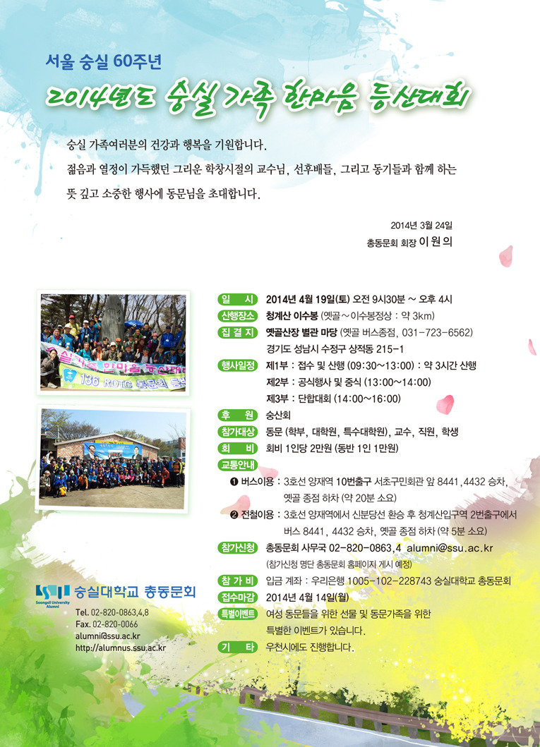 2014 숭실가족한마음 등산대회에 행정학부 동문님을 초대합니다. 작성자숭실대학교 총동문회|작성시간14.04.08|조회수84 목록 댓글 0 글자크기 작게가 글자크기 크게가 다음검색 현재 게시글 추가 기능 열기 북마크 공유하기 신고 센터로 신고 댓글 댓글 0 댓글쓰기 답글쓰기 댓글 리스트