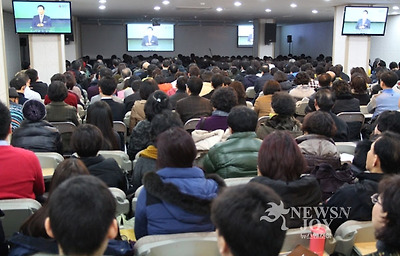 | ▲ 서울서머나교회는 김성수 목사가 2012년 4월 설립한 교회다. 김 목사는 2013년 3월 사망했지만, 교인들은 흩어지지 않고 장소를 얻어 김 목사의 영상 설교를 들으며 예배를 지속하고 있다. 주일예배 때는 본당에 빼곡히 앉고서도 자리가 없어 바깥 로비까지 의자를 놓는다. ⓒ뉴스앤조이 구권효 | ||