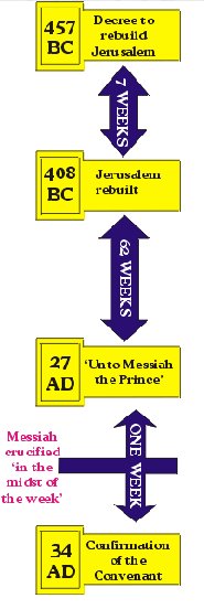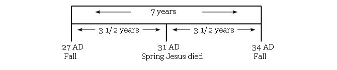 E) 그리스도의 죽음과 그 의미에 대한 예언의 성취: 70주일 중에 마지막 남은 1주일(70주일-69주일=1주일)인 7년 동안에는 무슨 일이 이루어질 것인가? 마지막 남은 한 이레에 대하여, 가브리엘 천사가 하는 설명을 들어보자. “육십이 이레 후에 기름부음을 받은 자, 곧 메시야가 끊어져 없어지겠고”(26절). 가브리엘 천사는 62이레 후, 즉 서기 27년 이후에 예수 그리스도께서 “끊어져 없어질” 것이라는 사실을 언급한 후에, 예수께서 메시아로서 하실 일에 대해서 자세한 설명을 다음과 같이 덧붙이고 있다. “그가 장차 많은 사람으로 더불어 한 이레(1 week) 동안의 언약을 굳게 정하겠고, 그가 그 이레(week)의 절반에 제사와 예물을 금지할 것이며”(27절). (여기서 “이레(week)의 절반”은 7년의 반이므로 3.5년 즉, 3년 반이 됨)