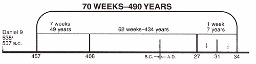 C) 70주 예언의 계산법: 기간적인 예언을 해석할 때에는 하나님의 계산법을 따라야 한다. 마치 건축기사들이 청사진을 만들 때, 1인치를 1피트로 계산하는 것처럼, 하나님께서 주신 기간적인 예언을 해석할 때에는, 그분께서 지정하신 계산법을 따라야 하는데, 그것은 에스겔 4:6과 민수기 14:34에 기록되어 있는 바와 같이 “1일은 1년이니라”라는 법칙이다. 따라서 70이레 즉, 70주일은 70 x 7 = 490일인데, 490일은 예언의 해석법칙에 따라서 490년으로 환산된다.