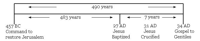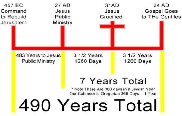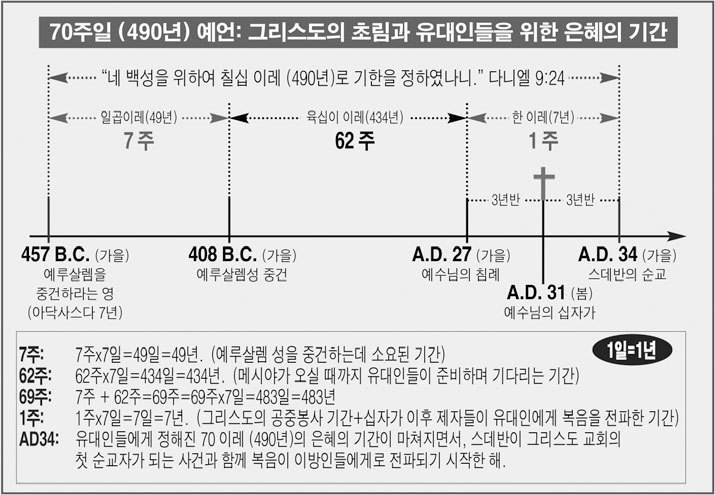 F) 유대인들을 위한 은혜의 시간의 종결: 이제, 마지막 1주일인 7년 중에서 나머지 3년 반이 지나면, 하나님께서 유대인들에게 허락하신 70주간의 전체 예언이 완전히 종결된다. 나머지 3년 반동안 제자들은 주로 유대인들의 구원을 위해서 끝까지 일했다. 예수께서 돌아가신지 3년 반 후인 서기 34년, 새언약의 복음을 끝까지 거절하는 유대인 지도자들을 향하여 경고와 호소의 설교를 하던 스데반에게 산헤드린 공회가 돌로 쳐서 죽이는 판결을 내림에 따라, 스데반은 그리스도 교회의 첫 번째 순교자가 되었으며(행 7:51~60), 이로서 유대인들을 위한 70주일(490년)의 유예 기간은 완전히 끝났으며, 곧 이어서 일어난 핍박과 함께 이방인들에게 복음이 전파되기 시작하였다(행 8:1~). “하나님의 말씀을 마땅히 먼저 너희에게 전할 것이로되 너희가 버리고 영생 얻기에 합당치 않은 자로 자처하기로 우리가 이방인에게로 향하노라”(행 13:46).