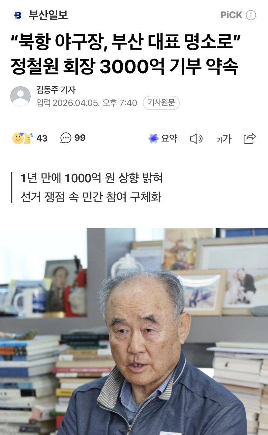 게다가 정철원 회장이 북항 돔구장 착공되면 3000억 기부한다고 하네요.(물론 시공을 댓가로 할것 같다는)..