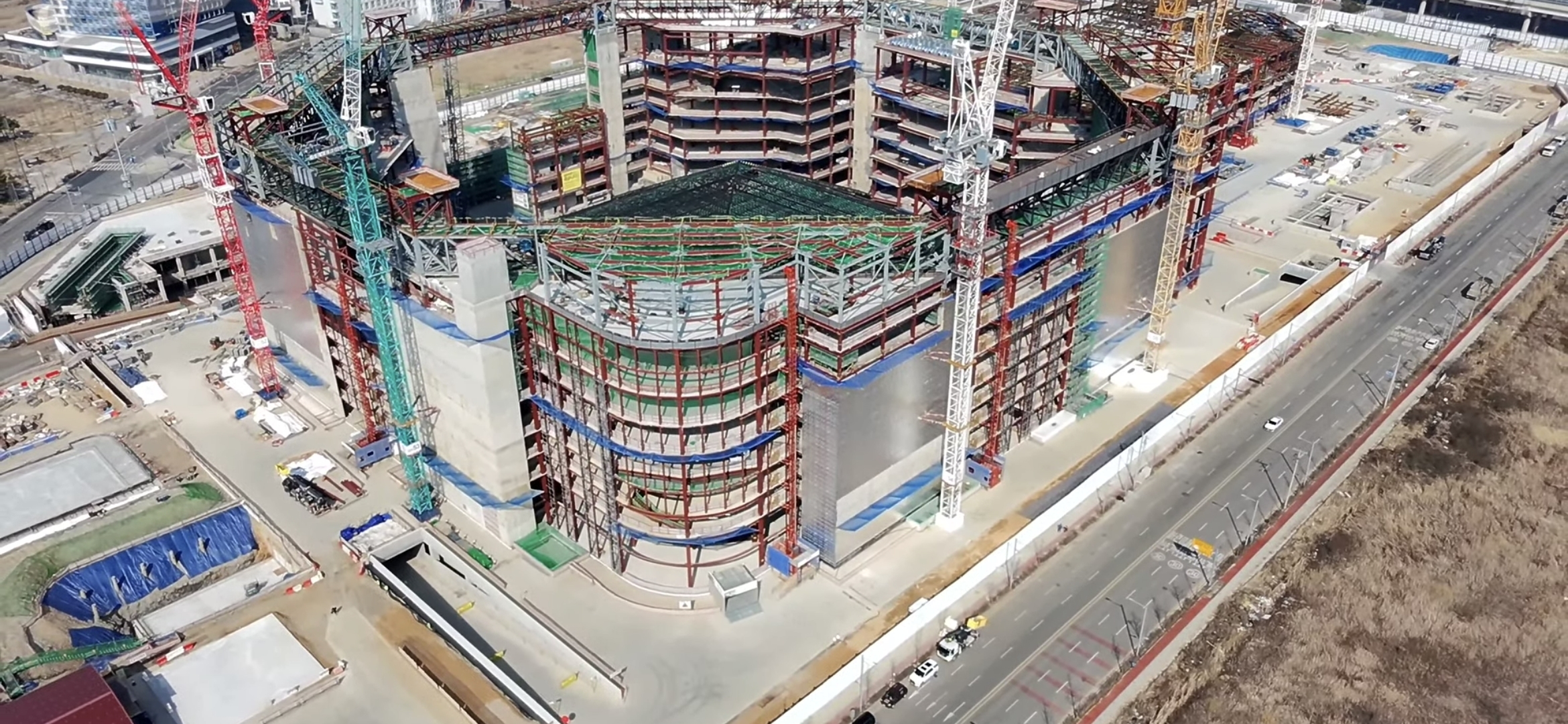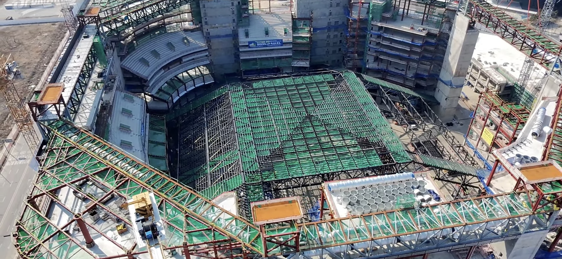작성자생활체육2030 작성시간 26.03.23 요즘엔 대부분 밑에서 제작해 한번에 끌어 올립니다.초기 사진 보니까 그라운드에 임시 기둥이 있더만요. 지붕 가운데 부분은 상부에서 작업하기 더욱 어렵기 때문에 아래에서 다 제작해서 올리고 주변부는 부분적으로 제작해서 중앙부와 결합하는 식으로 공사하지 싶네요. 저 기술은 그렇게 어려운 것도 아닙니다. 돈만 주면 다 되는 세상입니다.