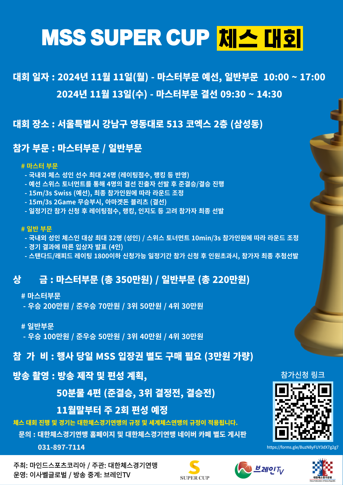 MSS SUPER CUP 체스대회 대회 공고문 작성자BRAIN X|작성시간24.10.24|조회수202 목록 댓글 0 글자크기 작게가 글자크기 크게가 다음검색 현재 게시글 추가 기능 열기 북마크 공유하기 신고 센터로 신고 댓글 댓글 0 댓글쓰기 답글쓰기 댓글 리스트