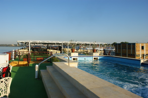 나일강 크루즈배우에서 한컷. 보기에는 수영장 넓어보이는데 별로 안크다. 양쪽으로는 선탠할수 있도록 해놓고 뒤에는 바도 있어 맥주한잔하기 좋다.