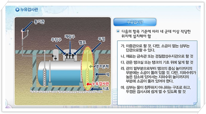 지하저장탱크의 주위에는 당해 탱크로부터의 액체위험물의 누설을 검사하기 위한 관을 다음의 각목의 기준에