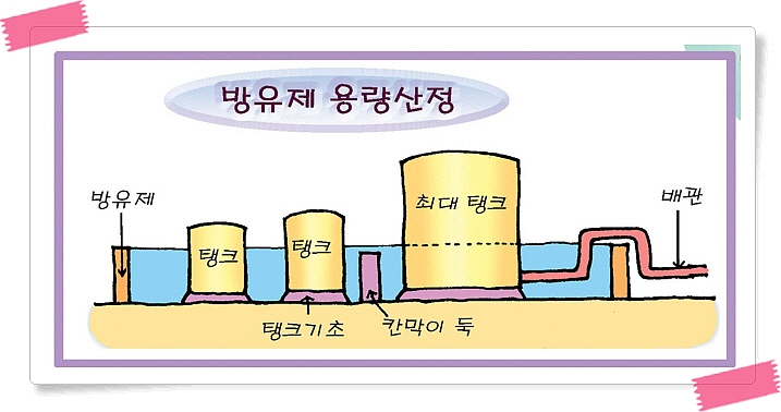 옥외탱크저장소 방유제 용량산정 작성자달봉이|작성시간11.02.24|조회수1,413 목록 댓글 3 글자크기 작게가 글자크기 크게가 방유제 용량산정 탱크가 1개일 경우 : 탱크용량의 110% 이상 탱크가 2개 이상 : 최대 탱크의 110% 이상 최대면적 : 8만제곱미터 이하 (높이 0.5미터 이상 3미터 이하) 최대 탱크수 : 10개 이하 다음검색 현재 게시글 추가 기능 열기 북마크 공유하기 신고 센터로 신고 댓글 댓글 3 댓글쓰기 댓글 리스트 작성자보아남 | 작성시간 17.08.15 감사합니다. 작성자굿데이 | 작성시간 20.01.01 감사합니다 작성자706324610 | 작성시간 20.05.08 감사합니다 댓글 전체보기