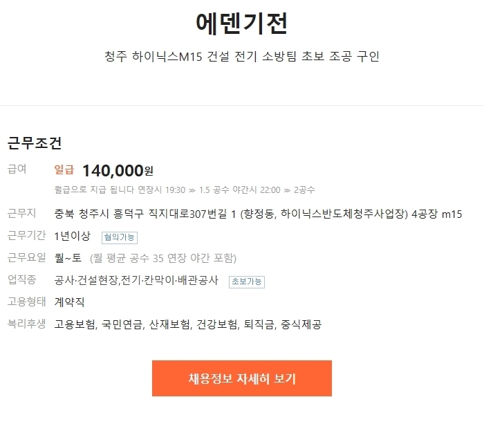 일급14만 [에덴기전] 청주 하이닉스M15 건설, 전기, 소방팀 초보 조공 모집 (~10/25)