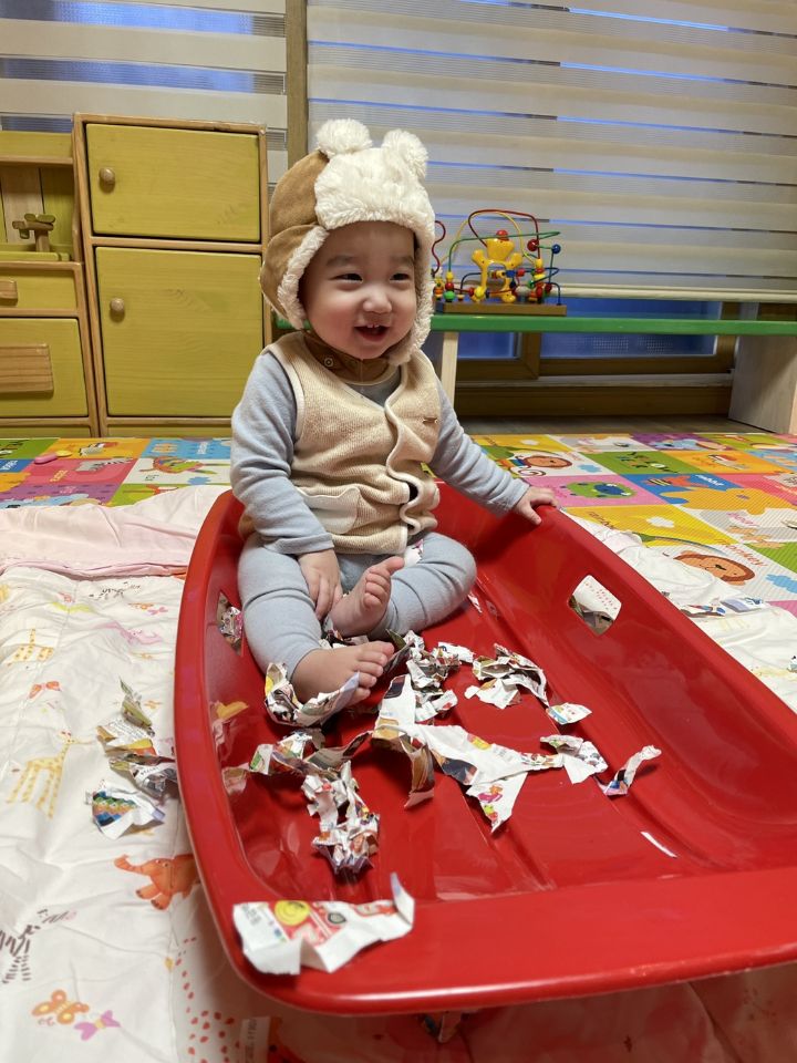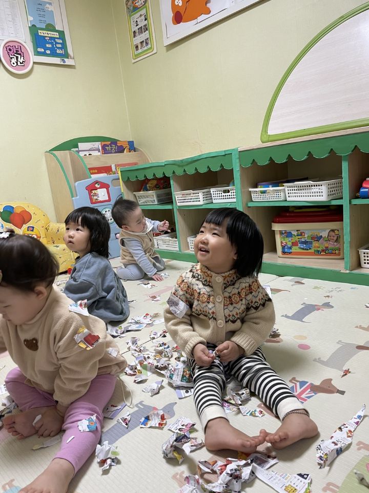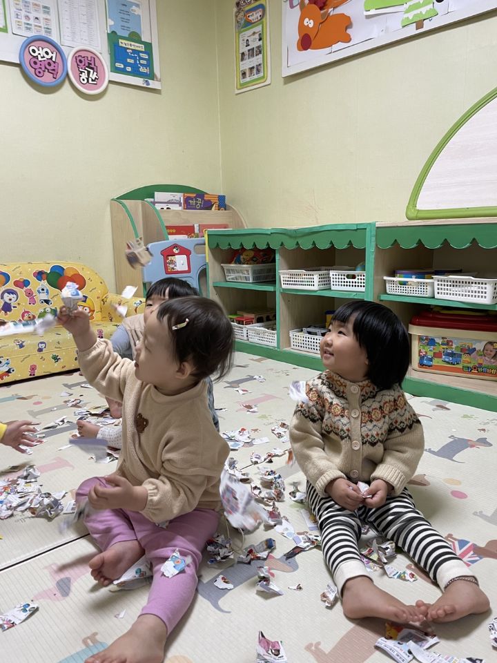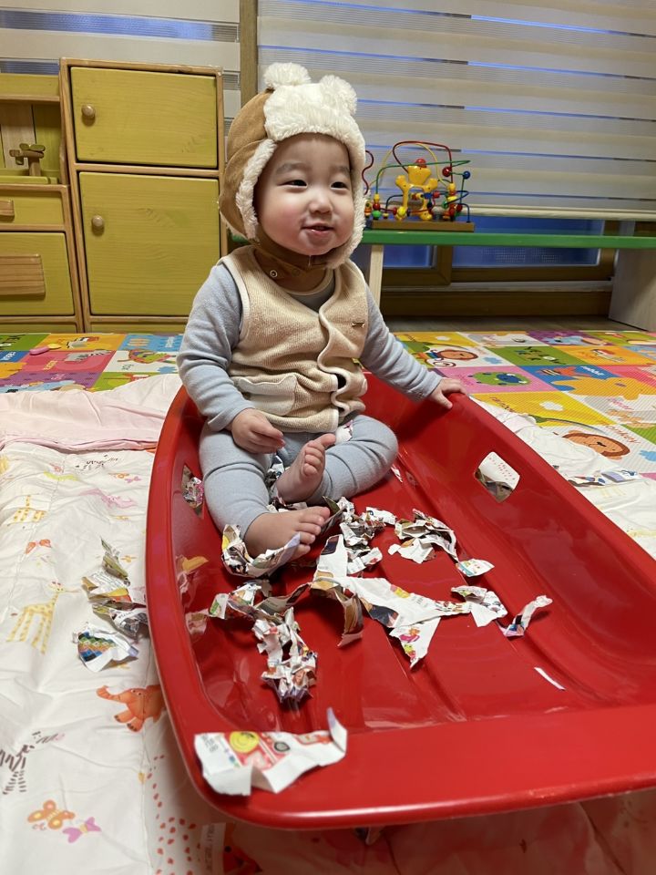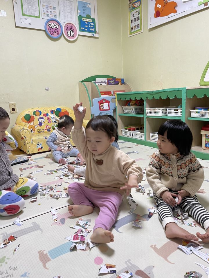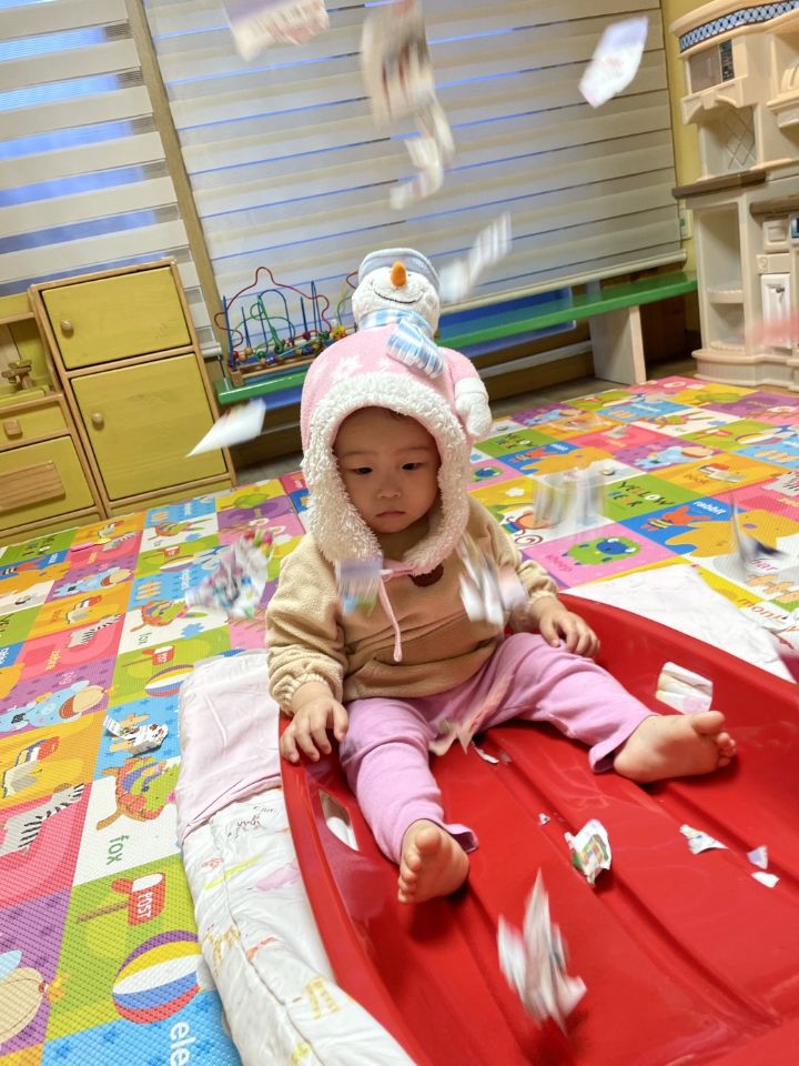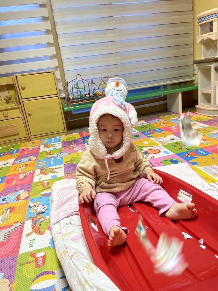 종이를 찢어 눈을 만들어보자고하니 인쇄된 사진을 보고 “이건 뭐야?“ 물어보는 친구들이 많아졌어요. 우리 귀요미들이 많이 성장했다는 생각을 들게 했어요. 눈 썰매를 더 타고 싶은 친구들이 많아서 여러번 태워주어도 내리지 않아서… 선생님이 타서 밀어달라고 하니 우리 친구들이 잠깐 힘을 주다가 ”안돼~“ 하더니 다른 곳으로 갔답니다. ❄️⛄️