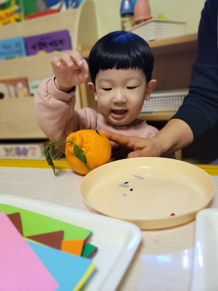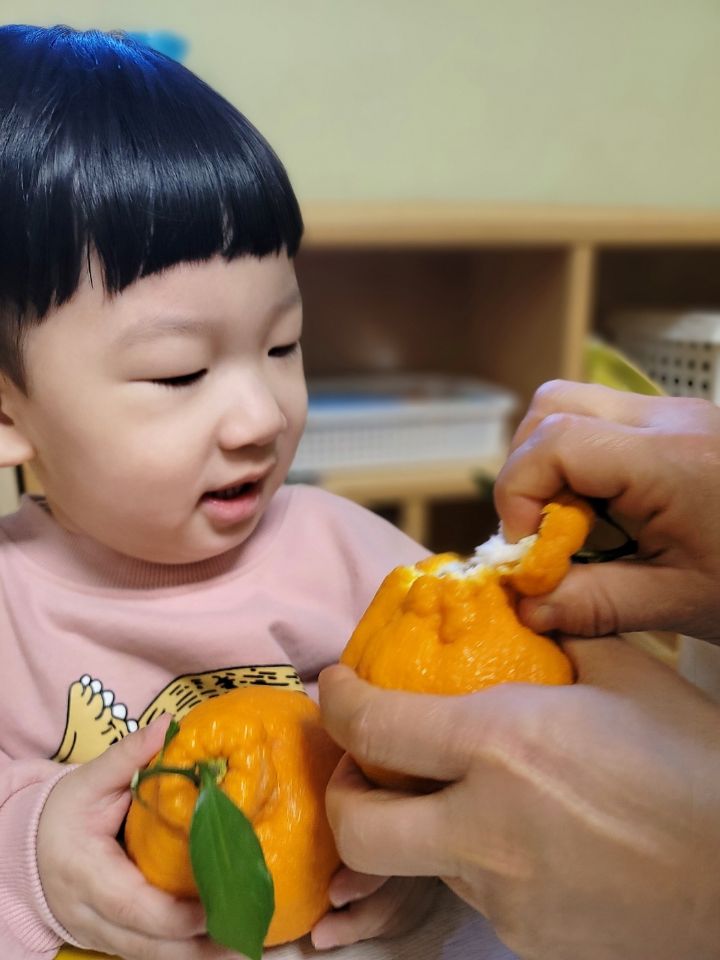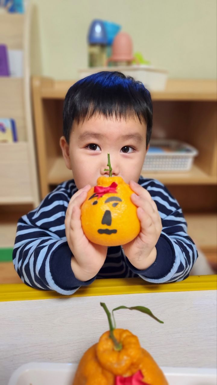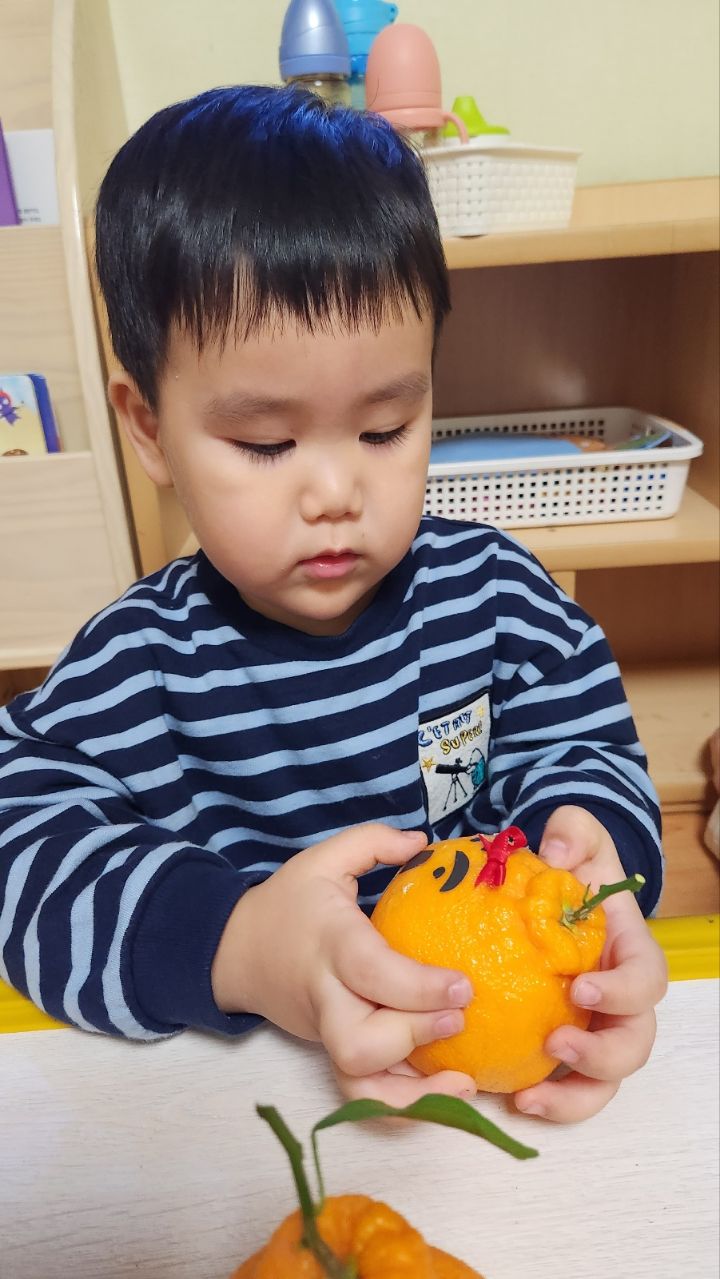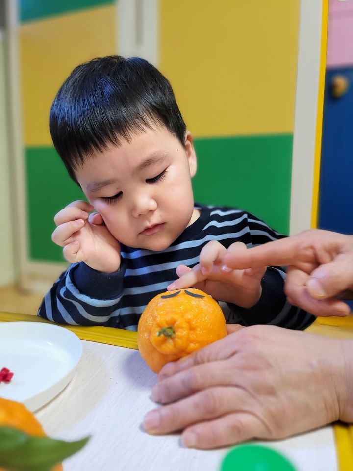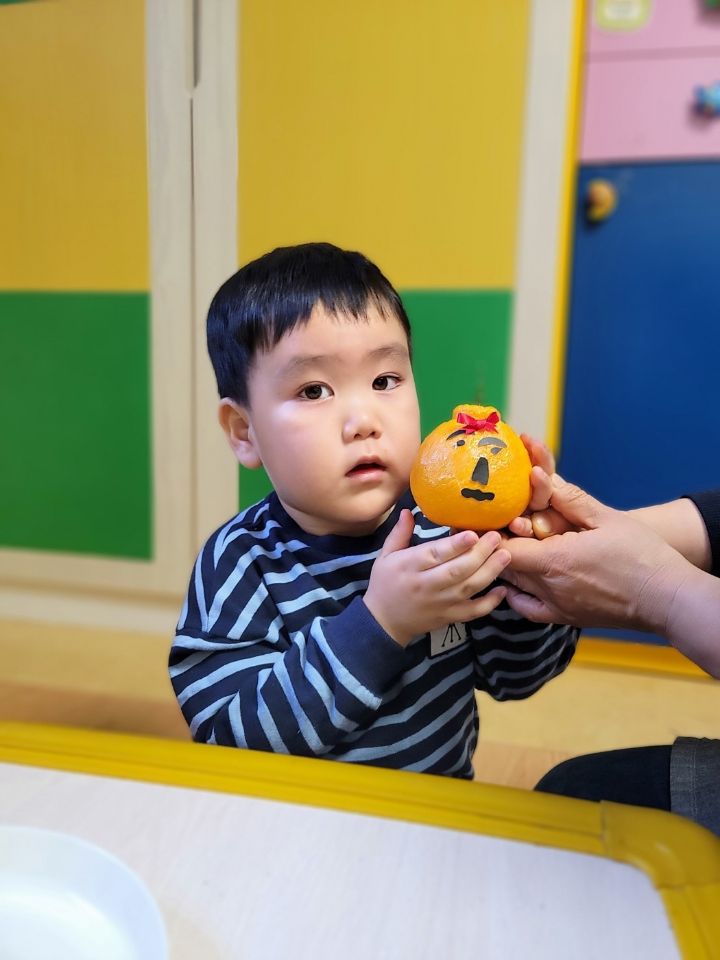 작성자모모와모모 작성시간 23.03.02 킁킁킁~!!무슨 냄새지~? 한라봉으로 관찰과 탐색하는데 우리친구들 색깔은 귤인데 귤보다 커서 궁금해하는 모습을 보이더라구요~ '이게 뭐야~?'하며 묻는 친구들~ 궁금해하는 친구들에게 한라봉이라며 알려주고 귤냄새와 다르다며 냄새를 맡아볼수있도록해주자 냄새를 맡고 너무 좋아하며 활짝 웃는 우리 친구들이였네요~한라봉으로색종이로 눈,코,입 예쁜 리본을 달아주어보았어요~ 한라봉에게 눈,코.입 꾸며주고난후 기분이 좋은지 한라봉을 마주보고 활짝웃음을 짓는 우리 친구들이였네요~~