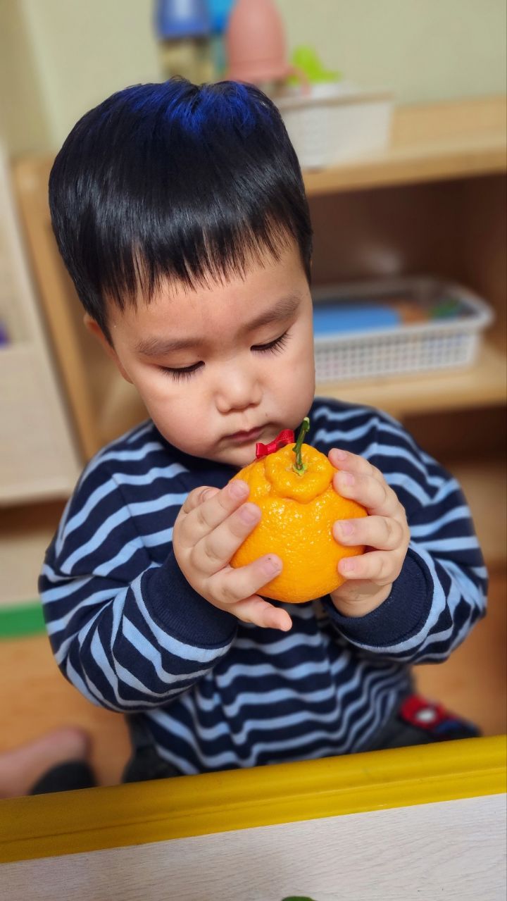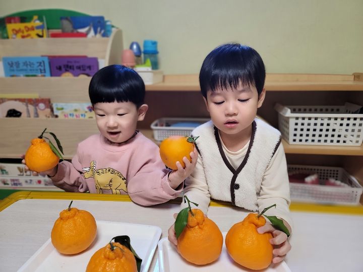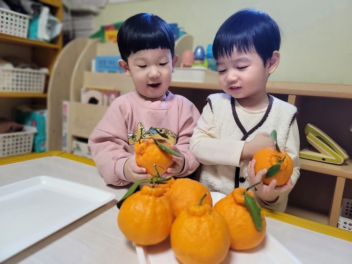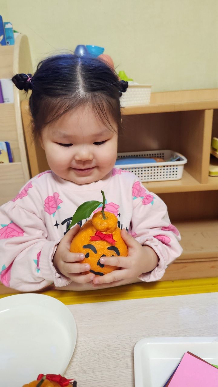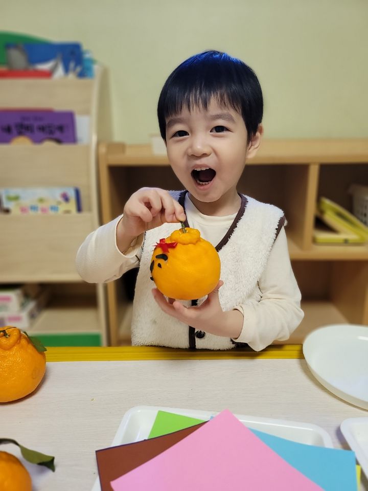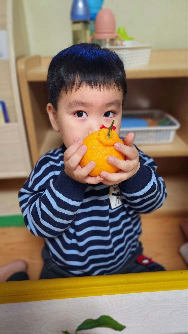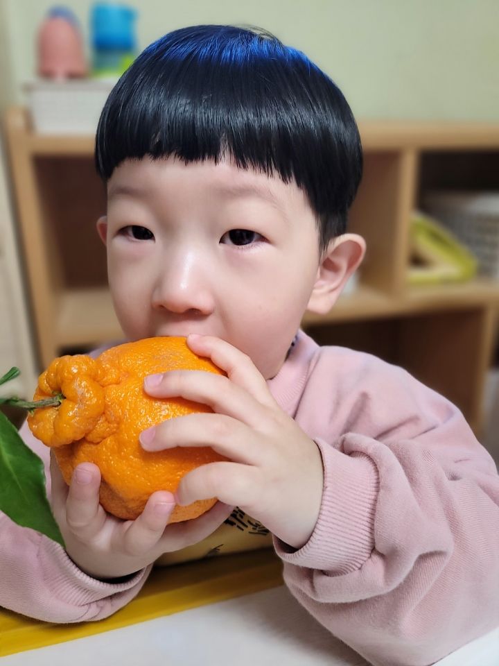 작성자모모와모모 작성시간 23.03.02 킁킁킁~!!무슨 냄새지~? 한라봉으로 관찰과 탐색하는데 우리친구들 색깔은 귤인데 귤보다 커서 궁금해하는 모습을 보이더라구요~ '이게 뭐야~?'하며 묻는 친구들~ 궁금해하는 친구들에게 한라봉이라며 알려주고 귤냄새와 다르다며 냄새를 맡아볼수있도록해주자 냄새를 맡고 너무 좋아하며 활짝 웃는 우리 친구들이였네요~한라봉으로색종이로 눈,코,입 예쁜 리본을 달아주어보았어요~ 한라봉에게 눈,코.입 꾸며주고난후 기분이 좋은지 한라봉을 마주보고 활짝웃음을 짓는 우리 친구들이였네요~~