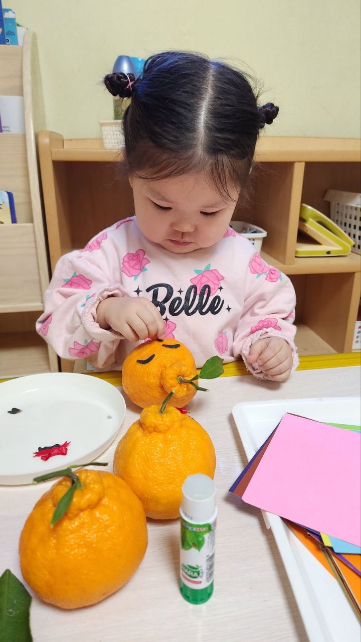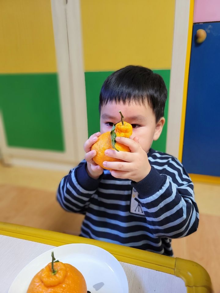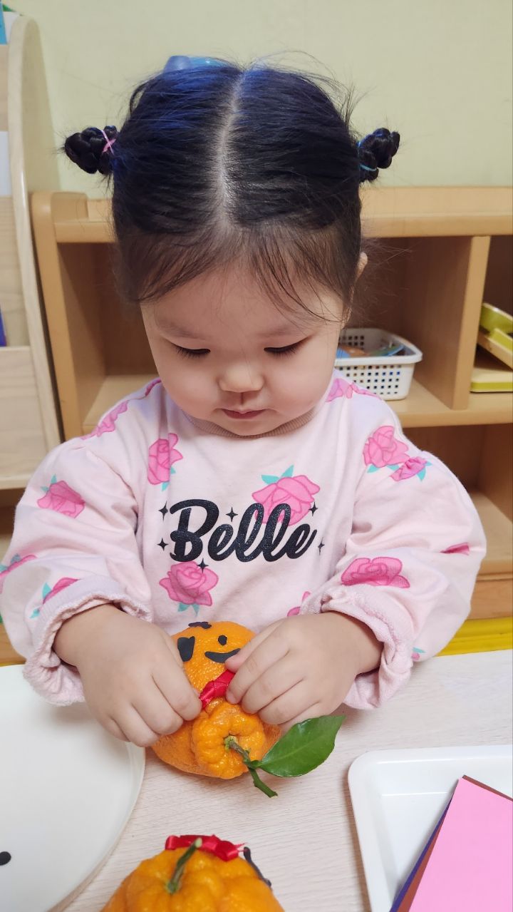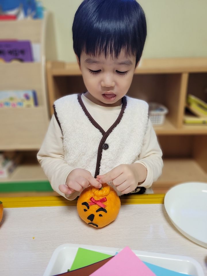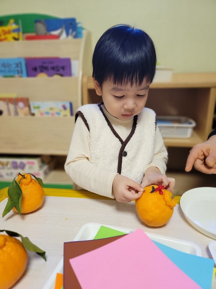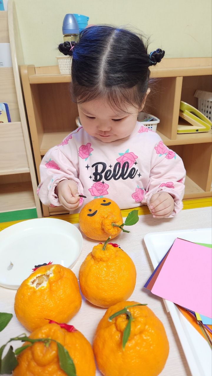 작성자모모와모모 작성시간 23.03.02 킁킁킁~!!무슨 냄새지~? 한라봉으로 관찰과 탐색하는데 우리친구들 색깔은 귤인데 귤보다 커서 궁금해하는 모습을 보이더라구요~ '이게 뭐야~?'하며 묻는 친구들~ 궁금해하는 친구들에게 한라봉이라며 알려주고 귤냄새와 다르다며 냄새를 맡아볼수있도록해주자 냄새를 맡고 너무 좋아하며 활짝 웃는 우리 친구들이였네요~한라봉으로색종이로 눈,코,입 예쁜 리본을 달아주어보았어요~ 한라봉에게 눈,코.입 꾸며주고난후 기분이 좋은지 한라봉을 마주보고 활짝웃음을 짓는 우리 친구들이였네요~~