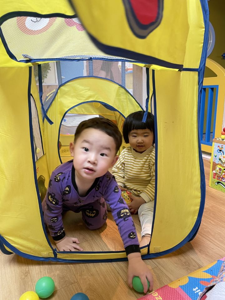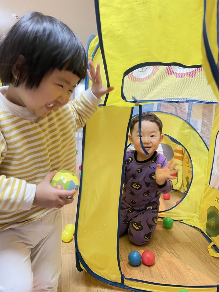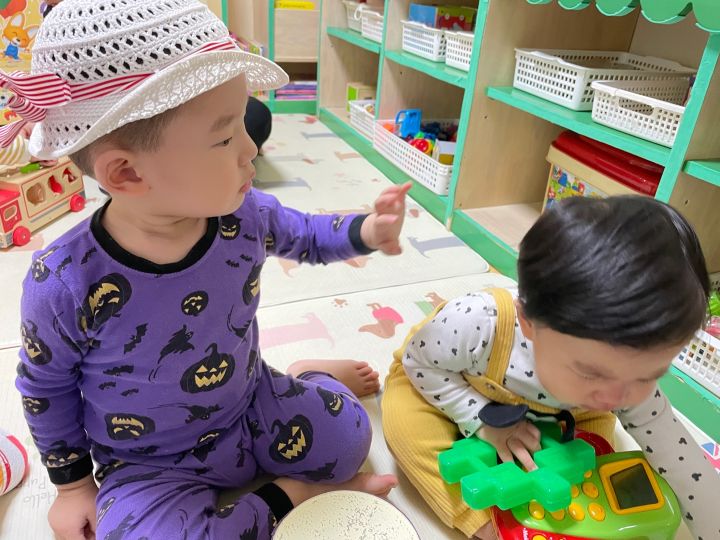 새 친구 하준이에게는 “오빠” 하며 까꿍 놀이도 해 주고, 우빈이는 좋아하는 모자도 주고 블록으로 만든 총도 주며 하준이에게 다가가는 모습을 보였답니다. 우리 귀요미들의 배려하는 모습을 보며 많이 성장했다는 생각을 했어요. 아파서 못 오는 막내 시후와 개구쟁이 도현이는 다음 주에 밝은 모습으로 등원했으면 합니다. 🌼