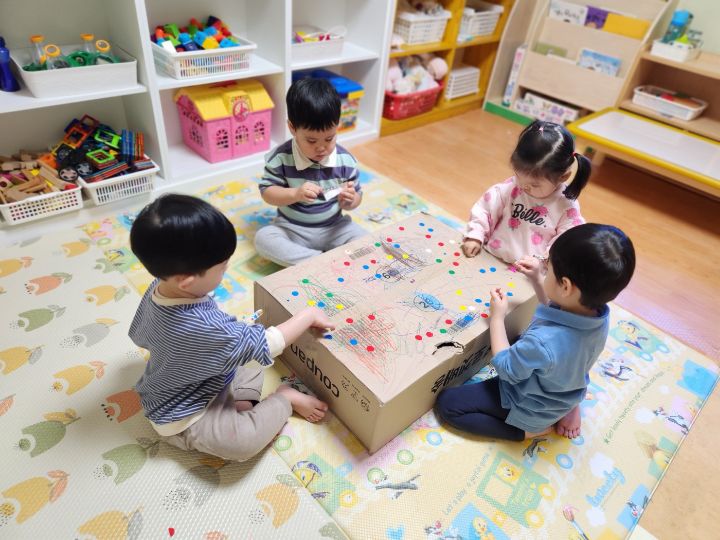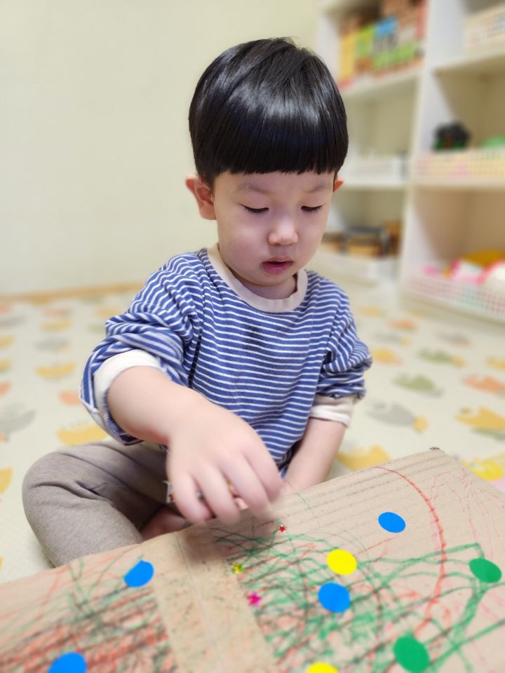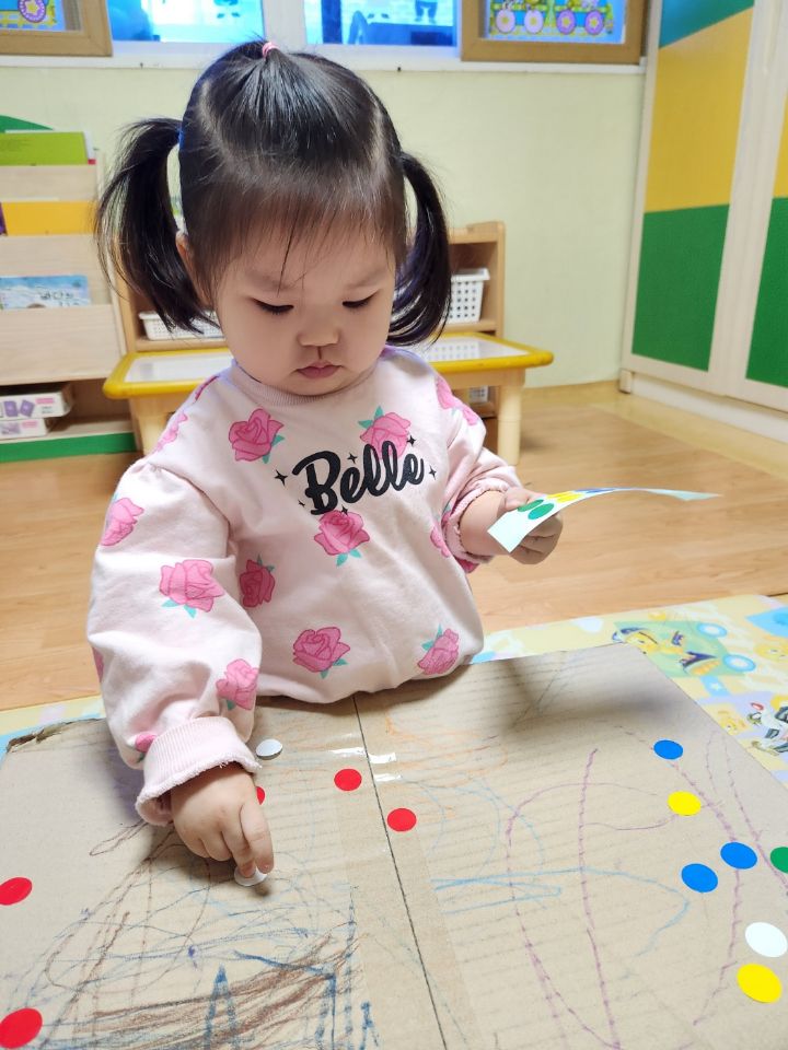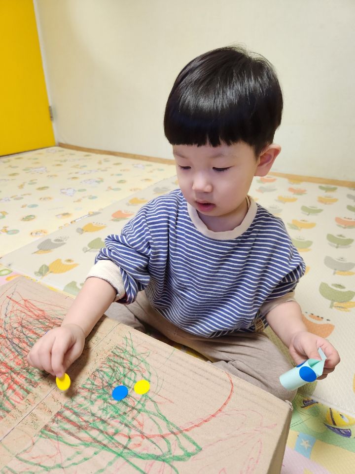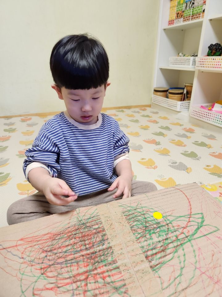 작성자모모와모모 작성시간 23.03.13 우리 친구들 상자위에 자유롭게 크레파스로 끼적이기와 알록달록 스티커를 붙여보며 활동해보았어요~ 상자를 보고선 너나할것 없이 놀이하던걸 멈추고 상자위에 신나게 끼적이기하며 놀이하는 우리 친구들이였네요~옷에 크레파스가 묻던말던 신경 쓰지않고 열심히 열정적으로 끼적이기하는데 그모습이 얼마나 웃기던지요~한참을 끼적이기하던 우리 친구들에게 스티커이야기를 하니 끼적이기하던 크레파스를 놓고 얼른 스티커를 달라고하여 주었더니 정신없이 붙이며 활동하는 우리 친구들모습들이였답니다~너무 신나게 놀이하는 우리친구들 모습이 예쁘더라구요~