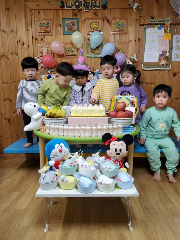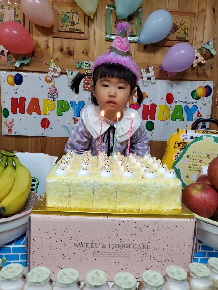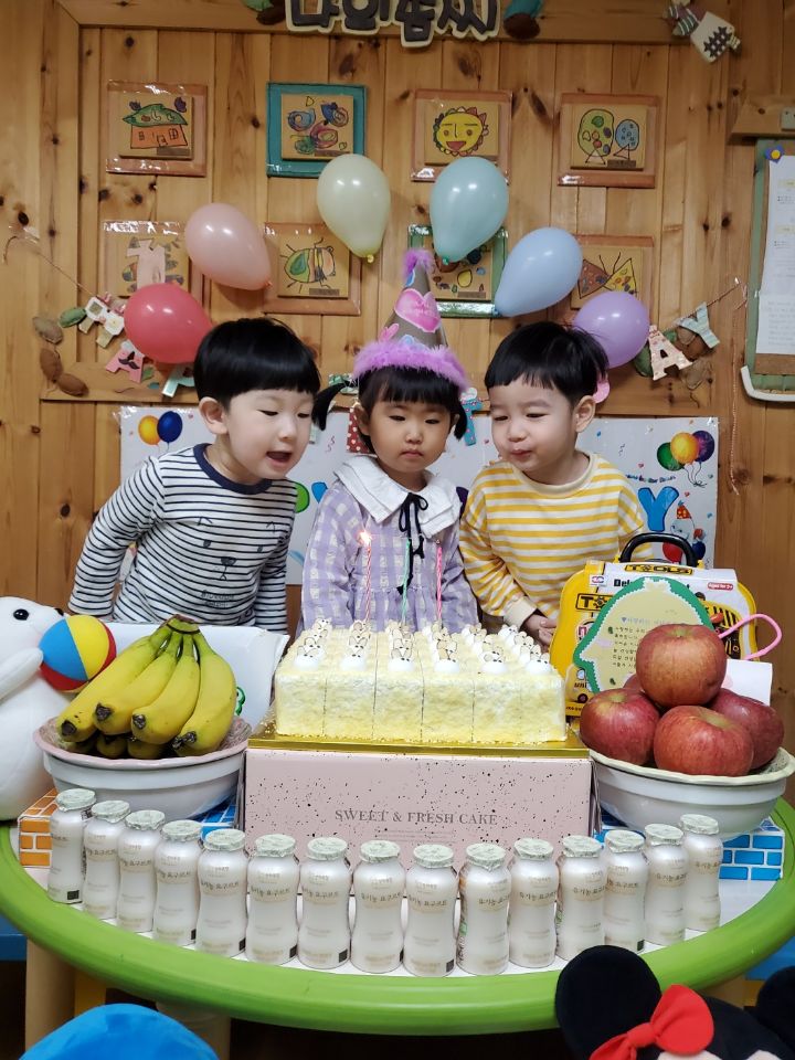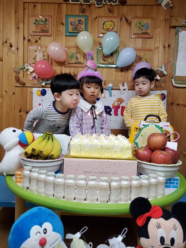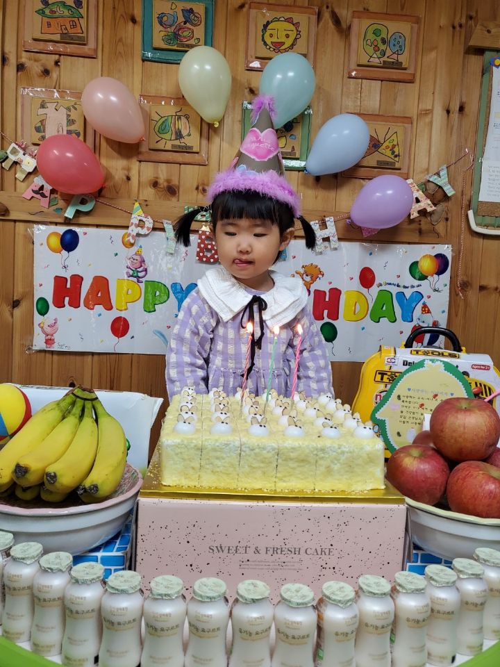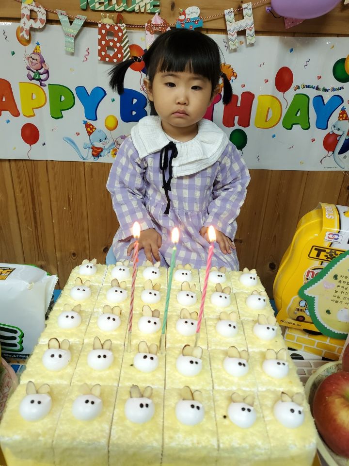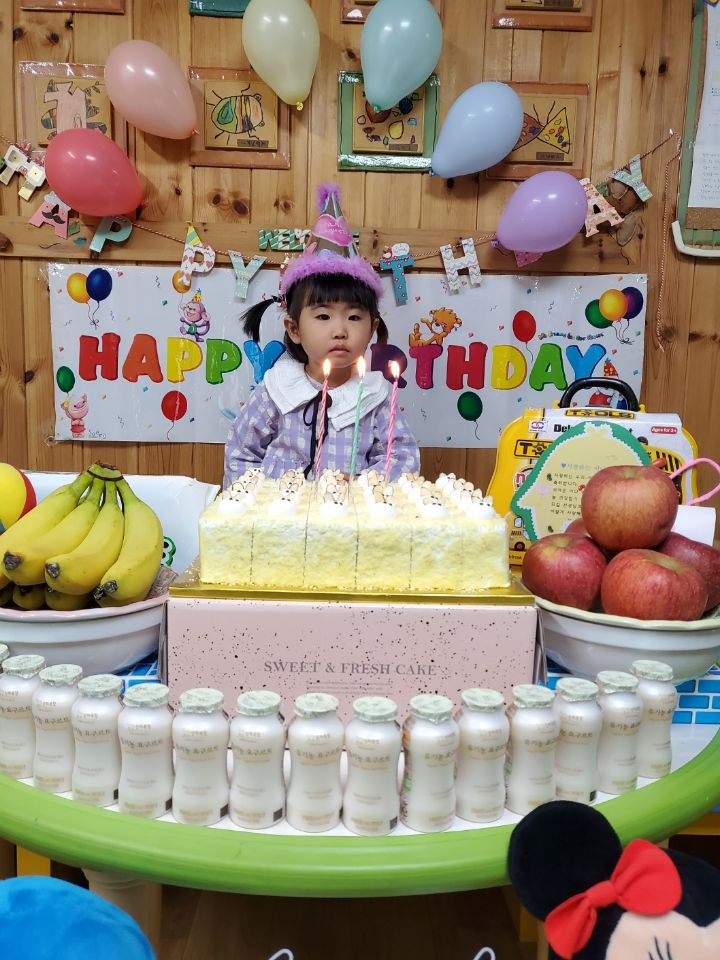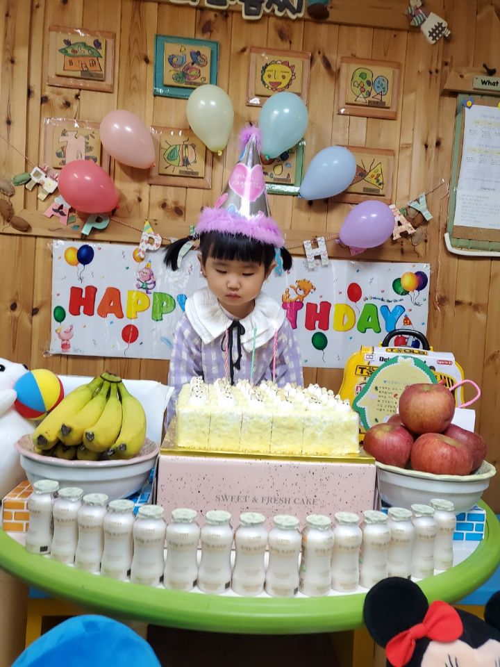 보라색 원피스가 라일락 향기를 내뿜는듯했어요. 이나는 사랑하는 아빠가 원피스를 사주셨다며 선생님에게 자랑을 했답니다.💐 이나의 친구들은 고열로 참석은 못 했지만 이나가 좋아하는 하율이 오빠가 축하의 인사를 받아서 너무 좋아했어요. 🎂