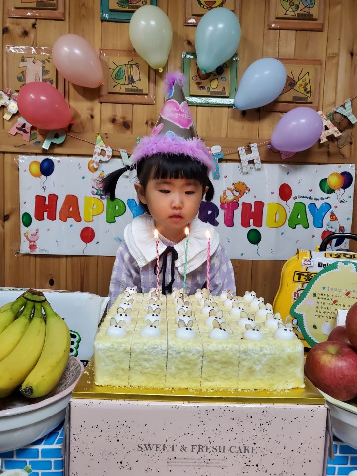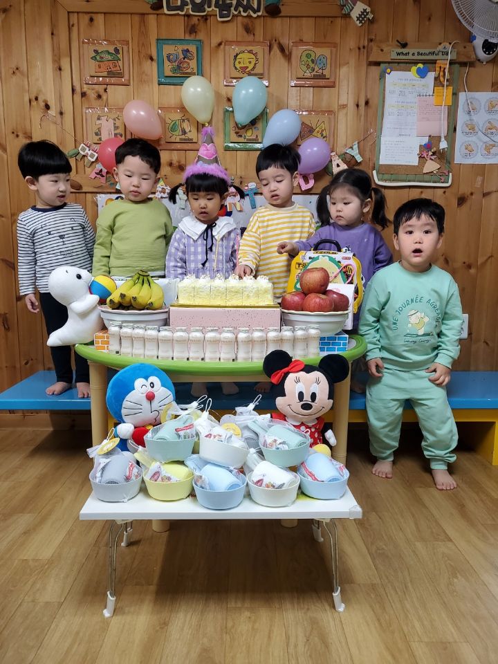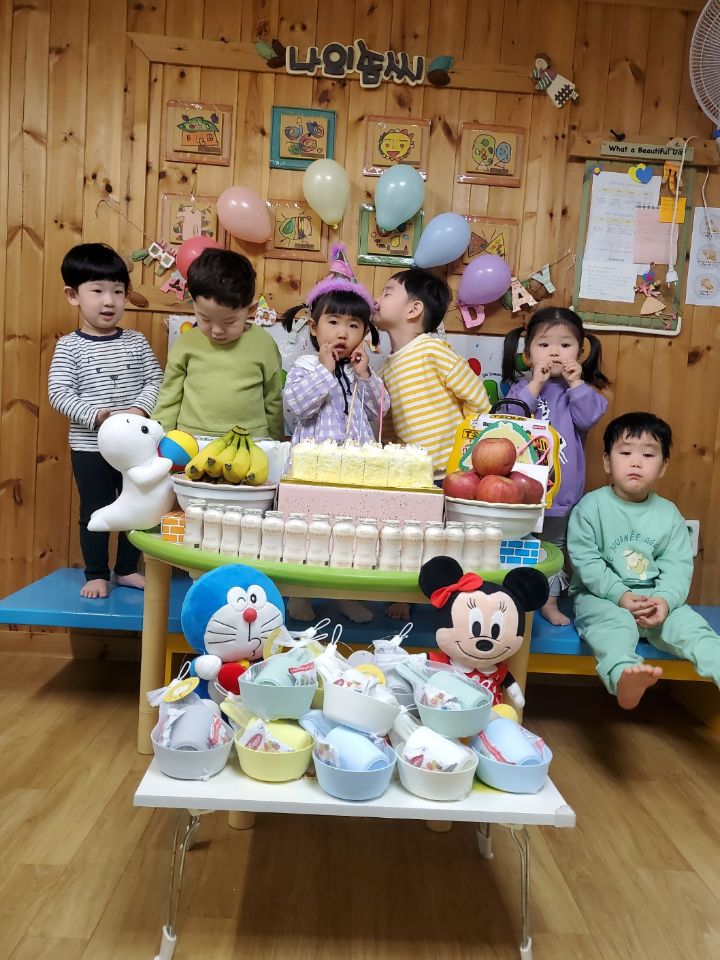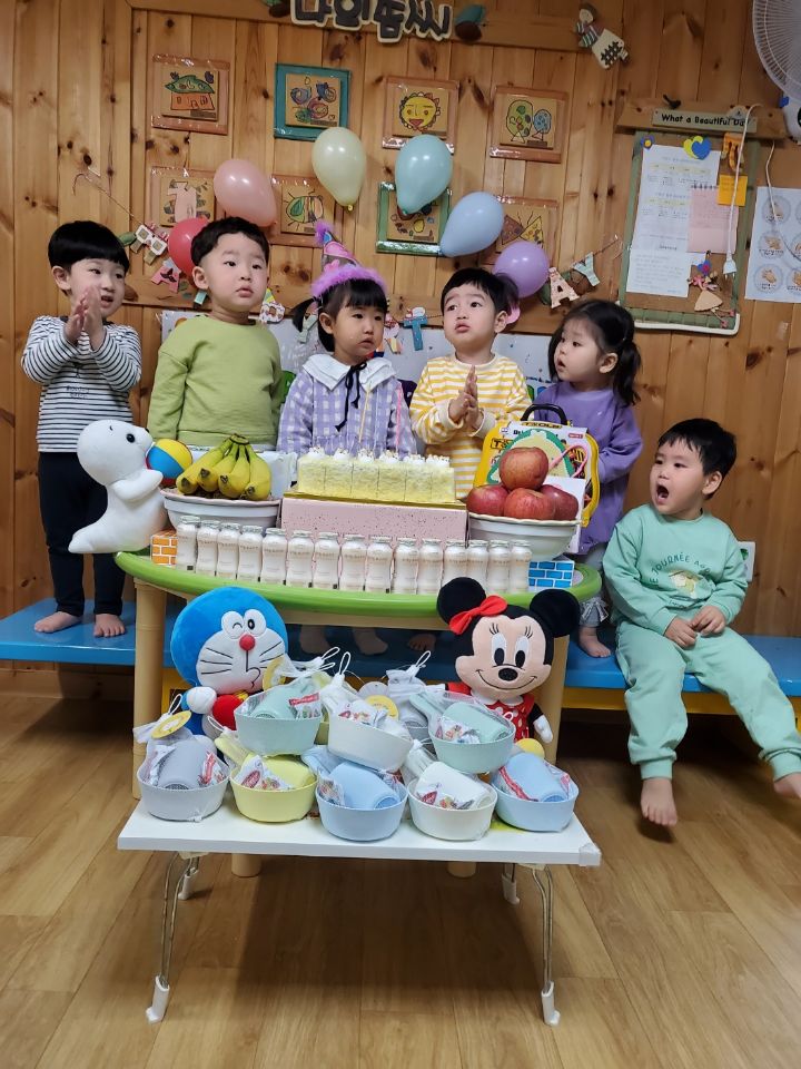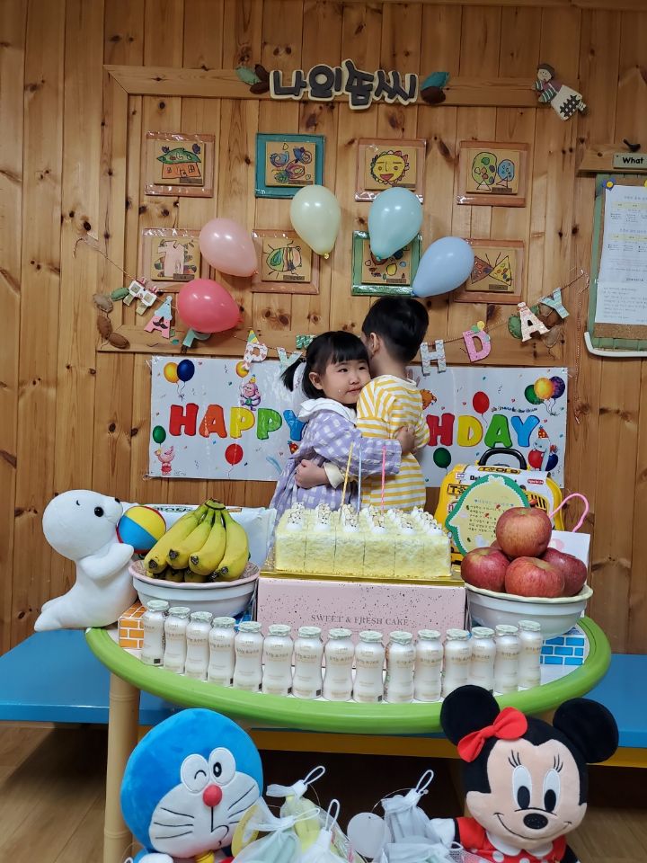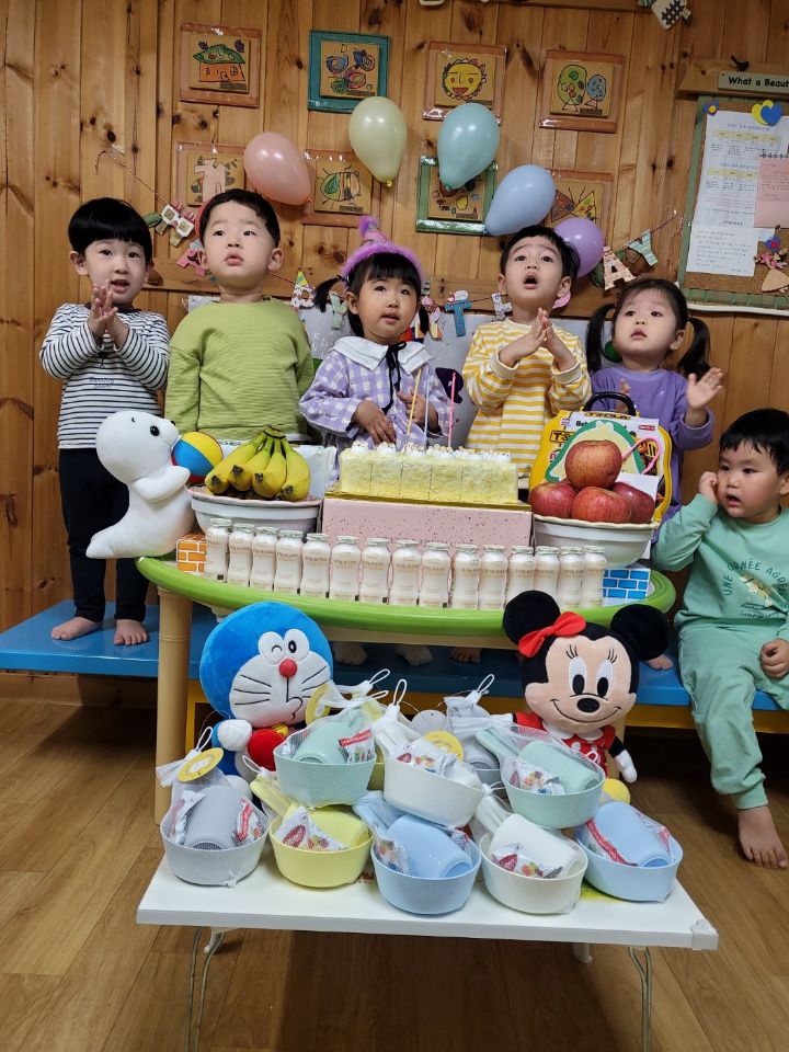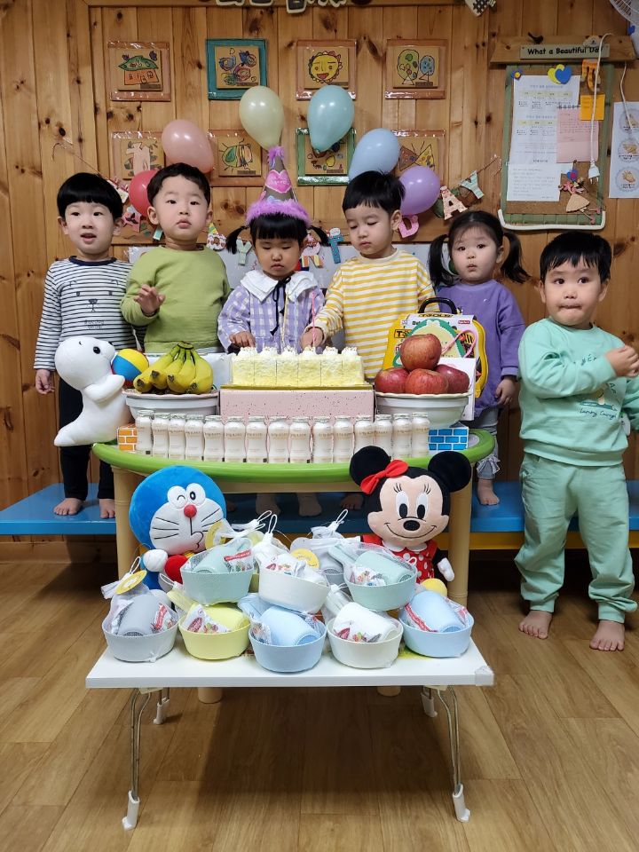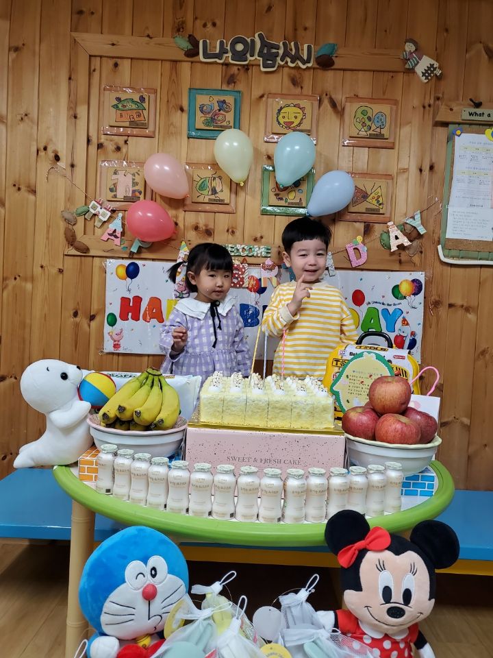 보라색 원피스가 라일락 향기를 내뿜는듯했어요. 이나는 사랑하는 아빠가 원피스를 사주셨다며 선생님에게 자랑을 했답니다.💐 이나의 친구들은 고열로 참석은 못 했지만 이나가 좋아하는 하율이 오빠가 축하의 인사를 받아서 너무 좋아했어요. 🎂