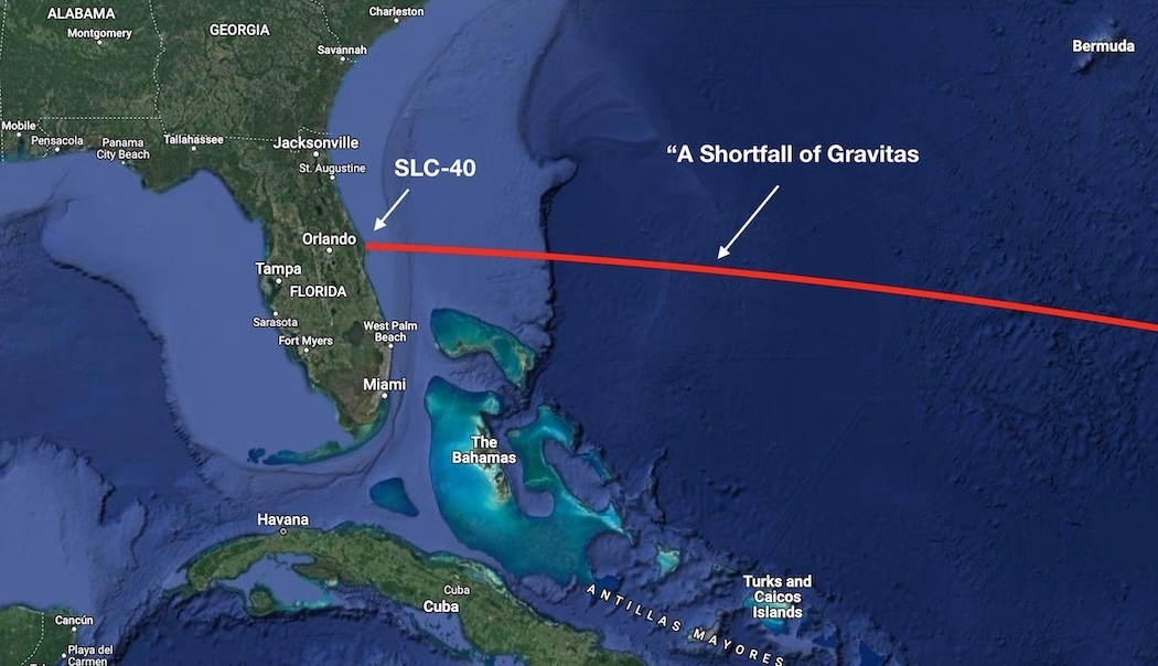 이 지도는 갤럭시 33/34 임무에서 팔콘 9 로켓에 대한 예측된 지상 트랙을 보여주며, 패드 40의 위치와 드론 선박 "그라비타스의 부족"이라고 표시되어 있습니다. 크레디트 : 우주 비행 지금