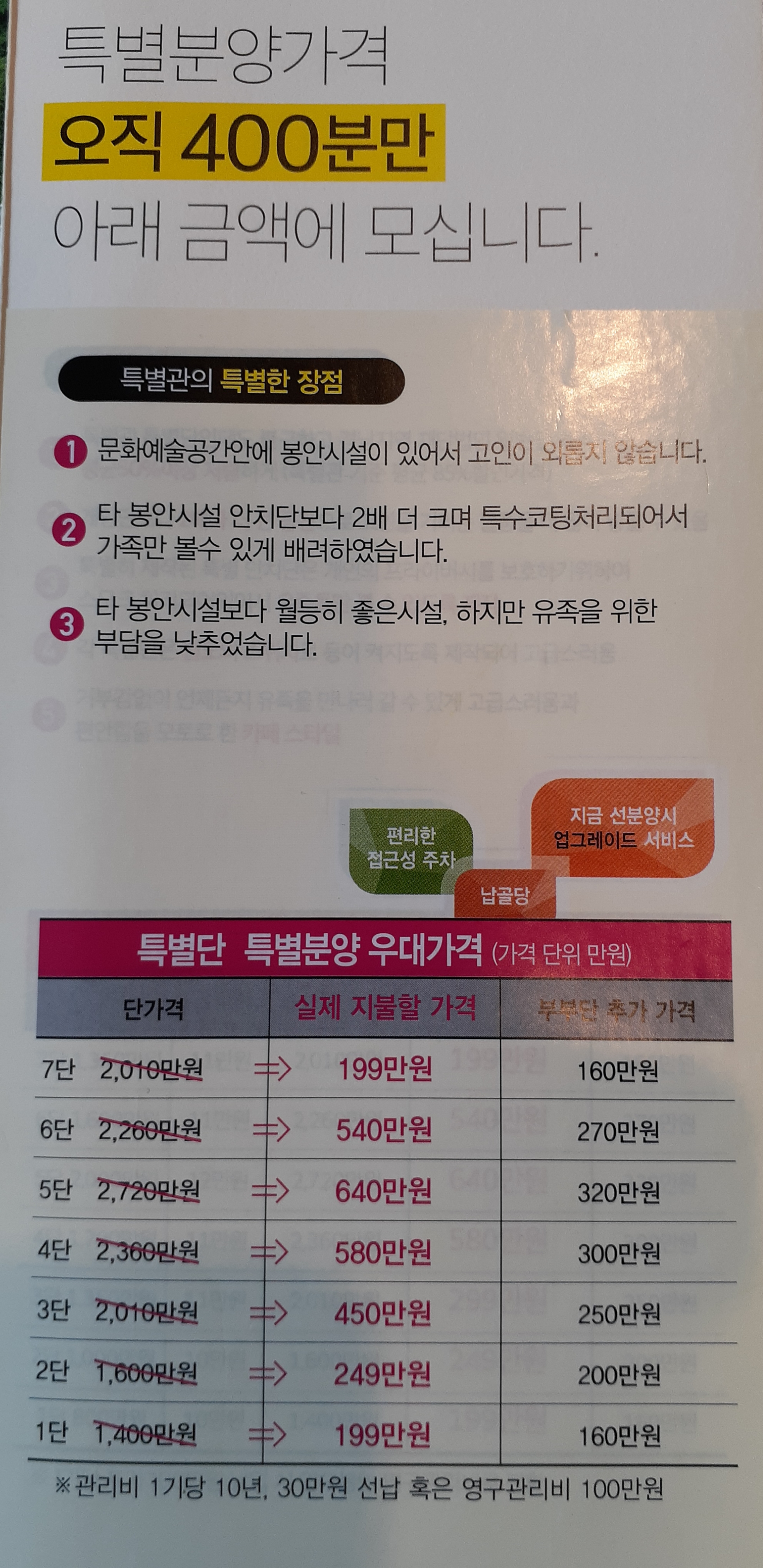 특별단은 크기가 일반납골당의 두배이상 이며 개인의 사생활존중을 위해서 유리를