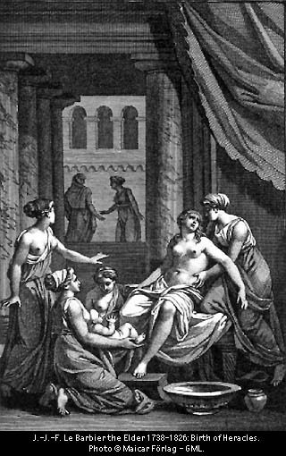 알크메네가 제우스의 아들 헤라클레스를 낳는 장면..