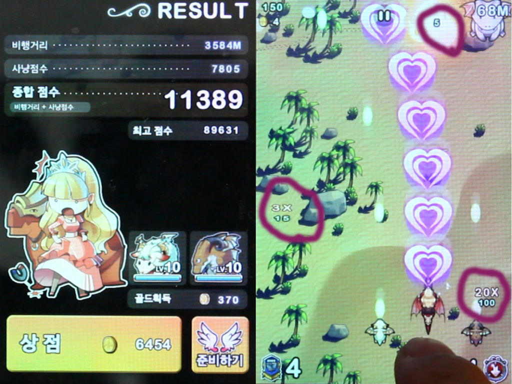 오른쪽 그림에서 우측 상단에 '68M'으로 표시된 부분이 비행거리이다. 이 거리는 게임을 시작하면 0에서 시작하여 계속 늘어나게 된다.