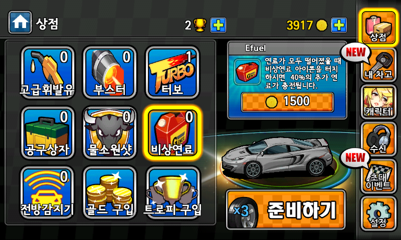 수리카 업그레이드를 Max 레벨까지 했다면, 상점에서 고급휘발유, 부스터, 터보, 비상연료 등을 잔뜩 산다.