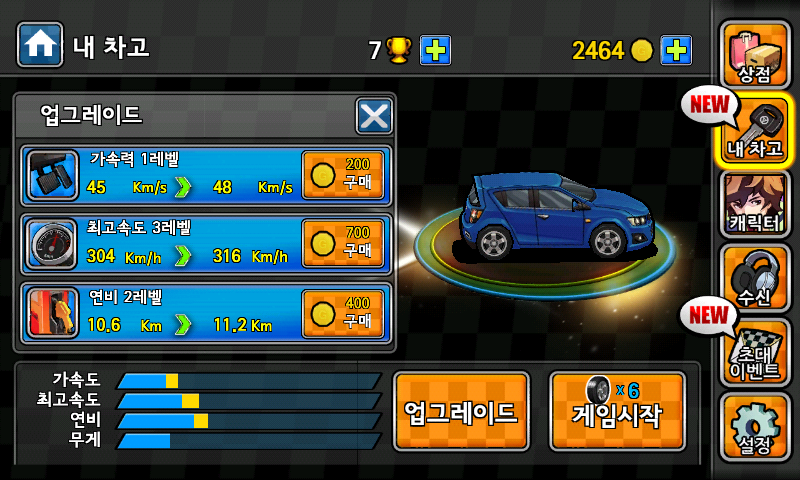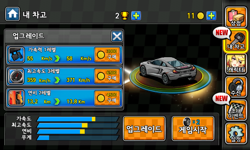 현재 레벨에서의 가속도, 최고속도, 연비에서 업그레이드할 경우 각각 하단 그래프에서 노란색으로 보이는 만큼 아주 조금 성능이 향상된다.