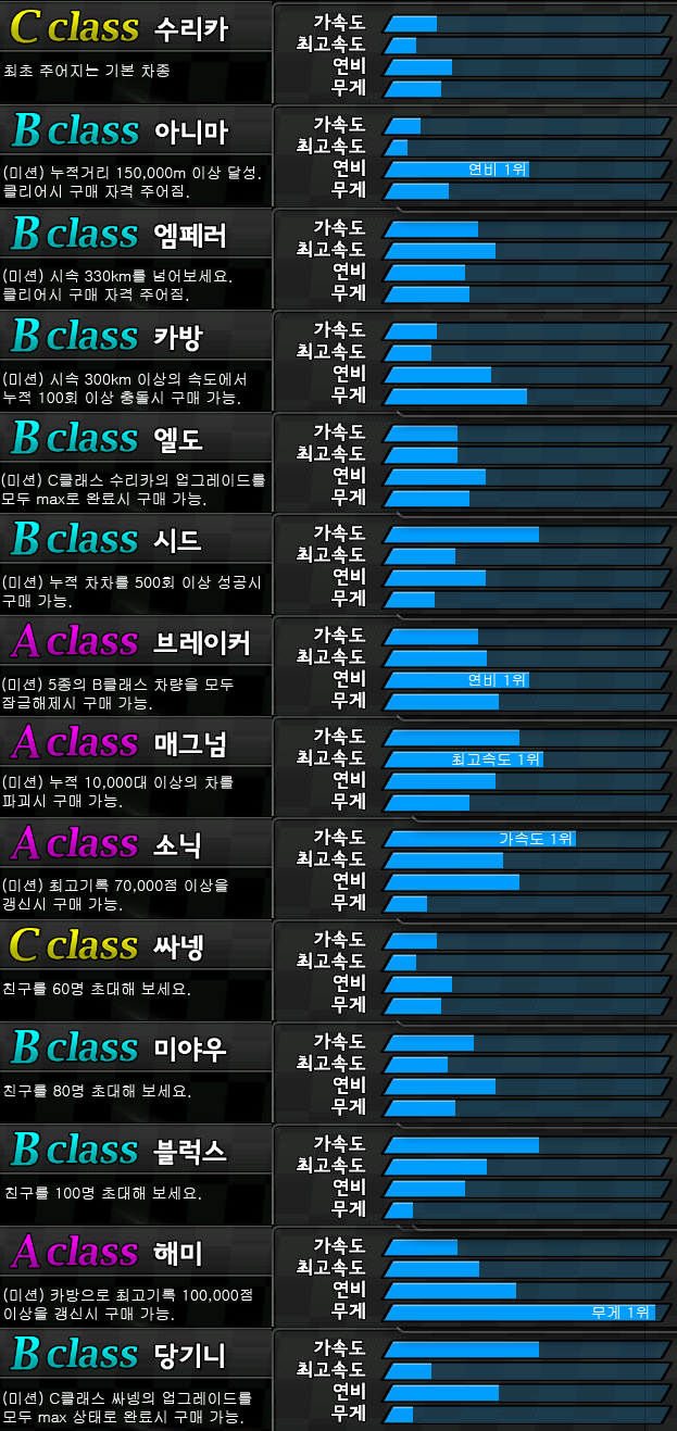 물리량으로 보면 A class 소닉이 가속도 1위에 연비도 높고, A class 매그넘은 최고속도 1위이다.