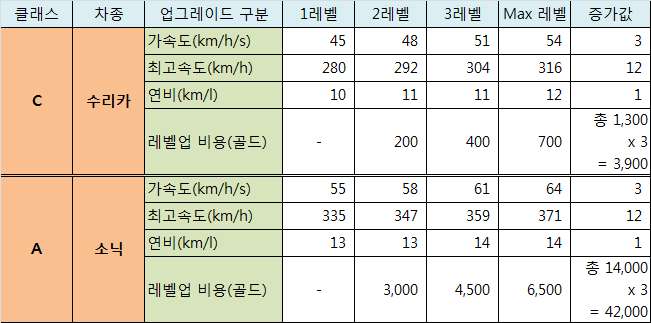 C 클래스와 A 클래스의 레벨업에 필요한 골드 비용은 아래와 같다.