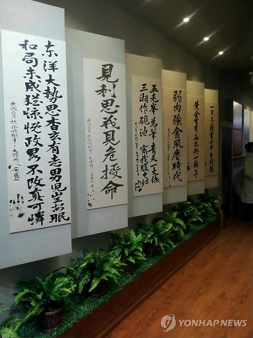 안 의사가 쓴 서예작품들이 전시된 것이 보인다