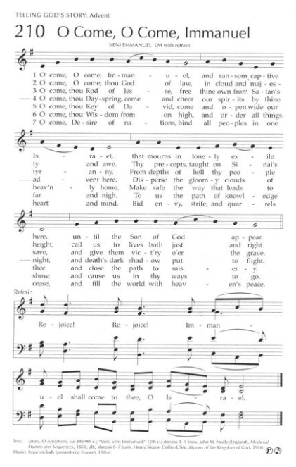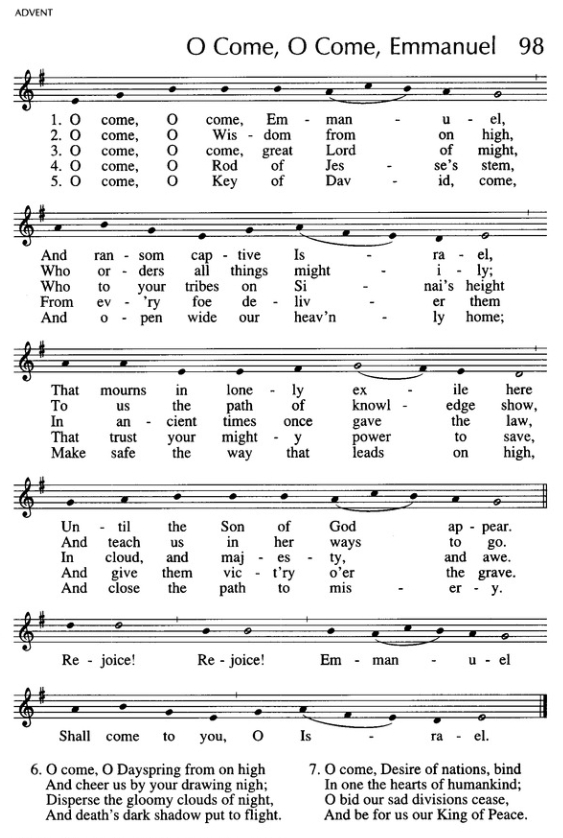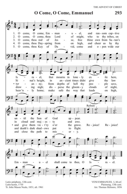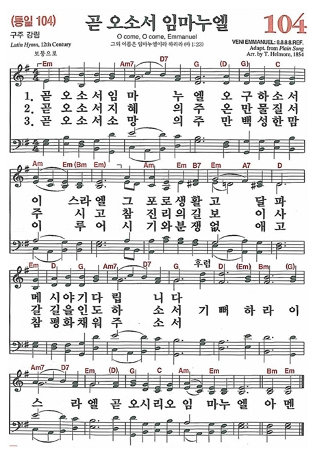 이 찬송도 12세기부터 전해오는 라틴어 찬송 ‘어서 오소서 임마누엘(Veni, veni Emmanuel)’을 영국의 존 메이슨 닐(John Mason Neale, 1818-1866) 목사가 영어로 번역한 것을 편곡하여 <중세 찬송가(Mediaeval Hymns, 1851)>에 처음으로 실은 찬송입니다.