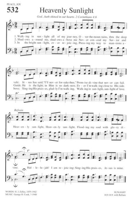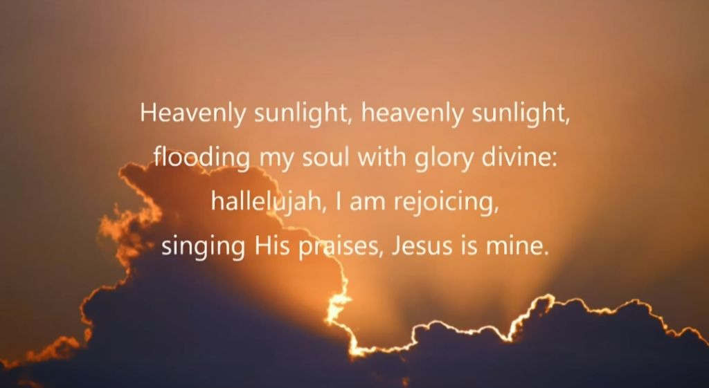 ‘하늘의 햇살, 하늘의 햇살, 거룩한 영광이 내 영혼에 넘치도다’ (Heavenly sunlight, heavenly sunlight, Flooding my soul with glory divine:)