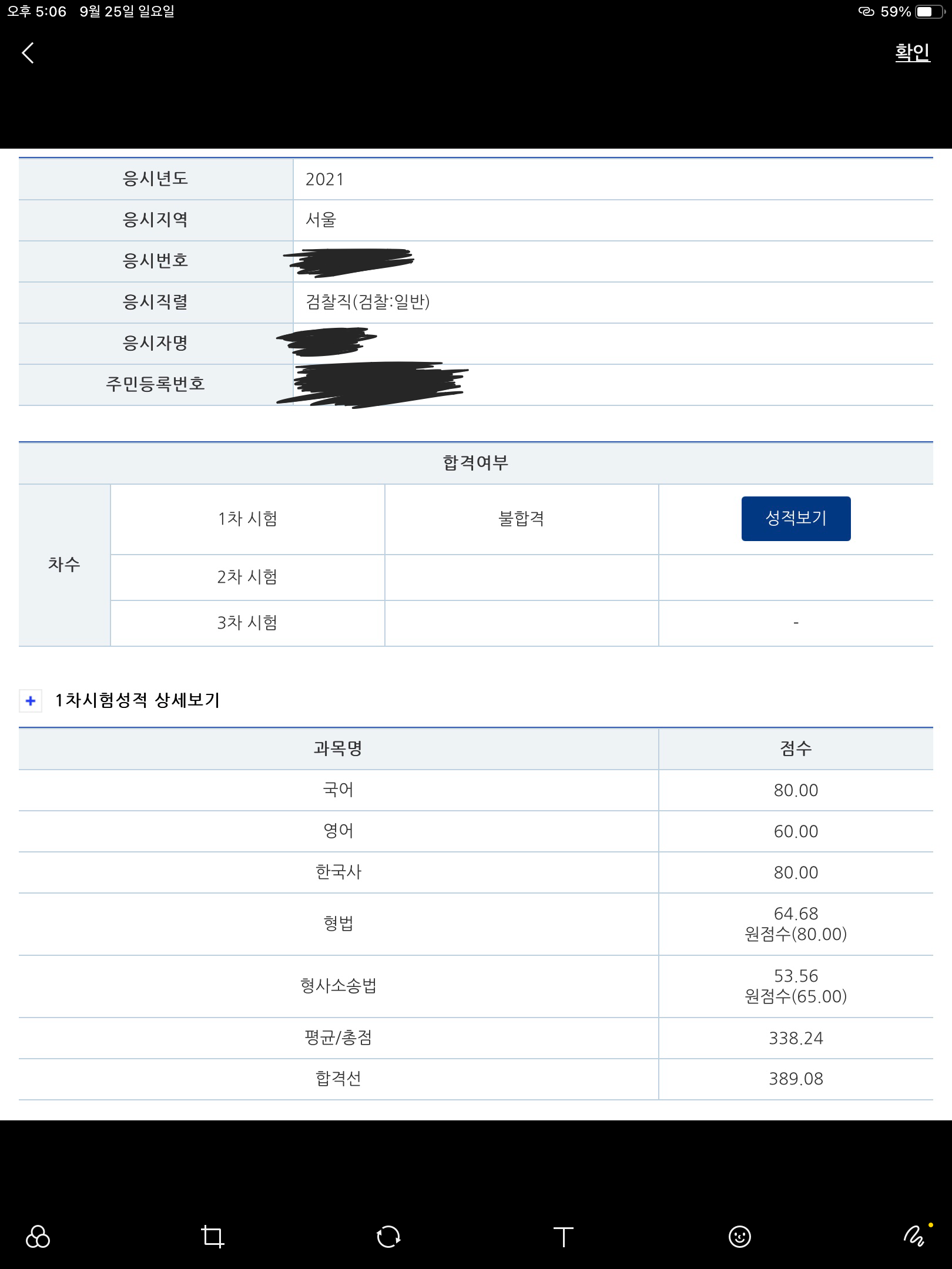 기본 베이스: 국어 80 영어 60 한국사 80 형법 80 형소법 65