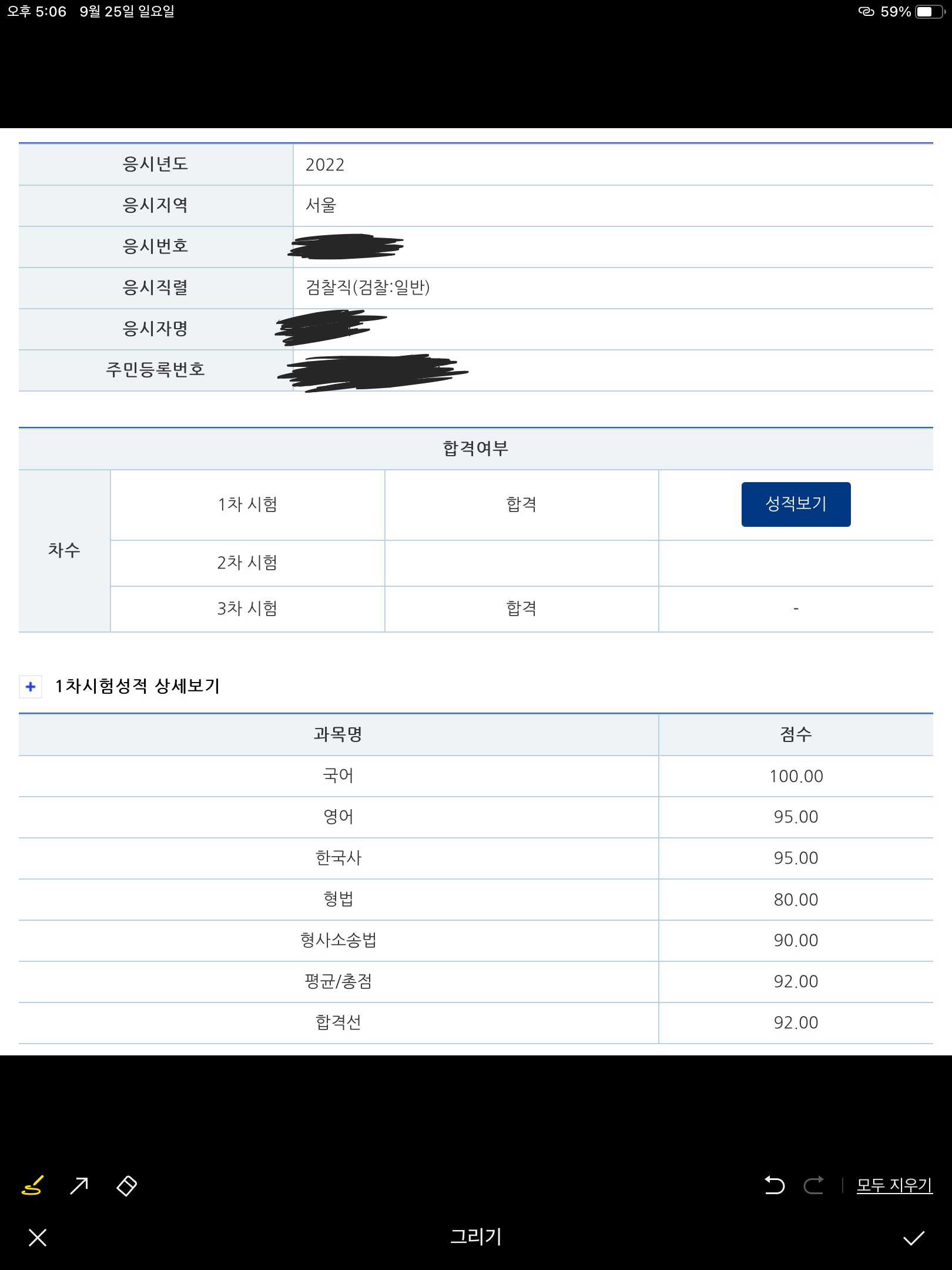 2022 성적: 국어 100 영어 95 한국사 95 형법 80 형소법 90