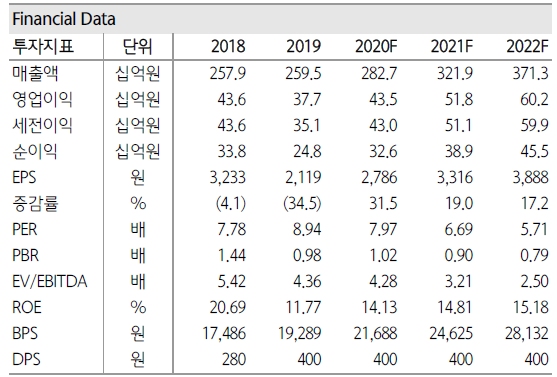 - 2020년 실적은 매출액 2,827억원(+8.9%, YoY)과 영업이익 435억원(+15.4%, YoY)으로 전망