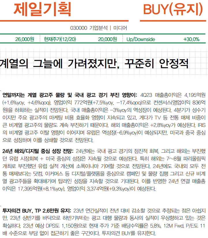 제일기획 : 계열의 그늘에 가려졌지만, 꾸준히 안정적 작성자맥가이버|작성시간23.12.21|조회수12 목록 댓글 0 글자크기 작게가 글자크기 크게가 다음검색 현재 게시글 추가 기능 열기 북마크 공유하기 신고 센터로 신고 댓글 댓글 0 댓글쓰기 답글쓰기 댓글 리스트
