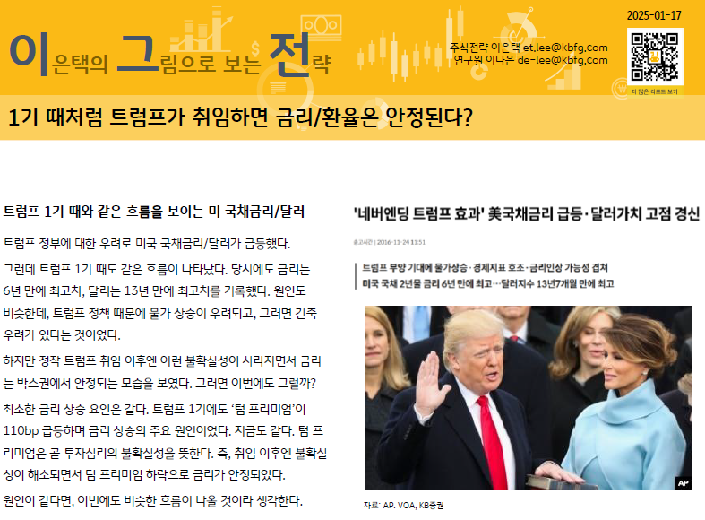1기 때처럼 트럼프가 취임하면 금리/환율은 안정된다? 작성자맥가이버|작성시간25.01.19|조회수15 목록 댓글 0 글자크기 작게가 글자크기 크게가 다음검색 현재 게시글 추가 기능 열기 북마크 공유하기 신고 센터로 신고 댓글 댓글 0 댓글쓰기 답글쓰기 댓글 리스트