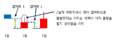 이틀 연속 갭하락은 동시호가시 허매도세력이 개입하였음을 의미하며, 이틀 연속 시초가가 최저가인 것은 개장과 동시에 세력이 개입하였음을 의미한다.