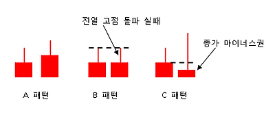A 패턴은 앞의 그림에서 나와 있듯 세력이 아직 물량을 털지 않고 있는 경우이다. 갭하락도 좋았고, 장중 고점을 돌파한 것도 좋았으며, 전일 대비 츨러스로 마감한 것도 좋았다. B 패턴은 세력 개입의 가능성이 어느 정도 예상되지만 전일의 매물벽 돌파에 실패한 패턴으로 하루 더 지켜봐야 한다. C 패턴은 둘째 날 갭하락으로 출발한 후 장중 시세를 분출하면서 전일 고점을 돌파하였으나 시세를 지키지 못하고 전일 종가 밑으로 밀린 경우다. 여기서는 세력이 이탈한 것으로 봐야 한다.