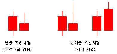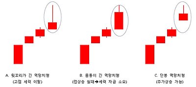 주가 수준이 하락 중이거나 상승 초입에 있는 경우라면 윗꼬리가 더 긴가, 몸통이 더 긴가에 상관없이 전체적으로 장대봉이 된다. 이는 세력 개입 시점이 장대봉이기 때문이다.