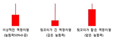 꼬리 길이별 역망치형 캔들의 종류는 3가지로 윗꼬리가 몸통의 길이와 비슷하면 가장 이상적인 형태이다.