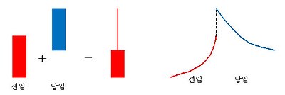 전일 양봉과 당일 음봉을 합하면 역망치형이 등장. 즉 둘째날 조정 음봉이 모두 해소된 역망치형이 된다.