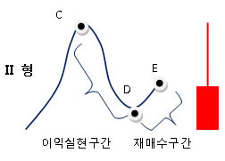 II-형은 C 지점에서 매물이 출회되기 시작하지만 D~E 시점에서 저가 매수세가 유입되어 반등에 성공한 패턴이므로 최상의 역망치라고 볼 수 있다. 만약 C에서의 매도 세력과 D~E의 매수세력이 동일하다면 급등 가능성도 있다. 따라서 시점별 창구분석이 필요할 수 있다.