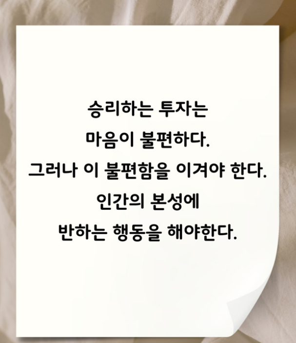작성자나는된다! 작성시간 25.04.22 승리하는투자는 마음이 불편하다. 그러나 이 불편함을 이겨야한다. 인간의 본성에 반하는 행동을 해야한다. ~~~ 따라적으며 마음에 새겨봅니다. 감사합니다~~^^