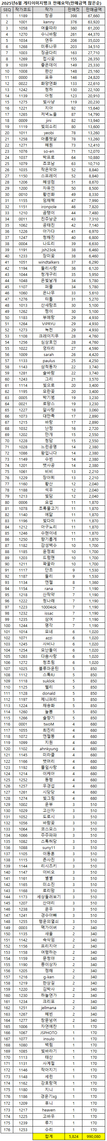 | SEQ | 사진.. 클릭하면 링크 | 사진번호/파일번호 | 컷수 | 금액 | 작가 |