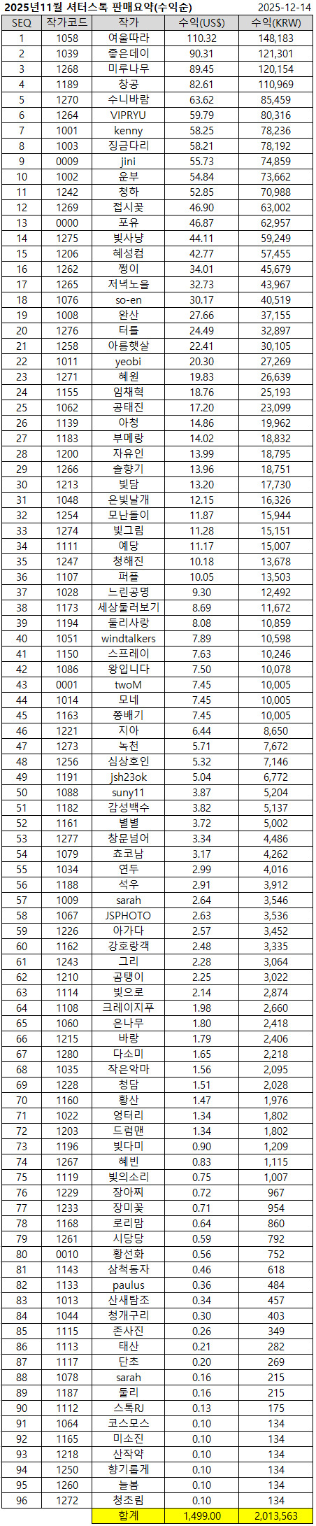 | SEQ | 사진번호/파일번호 | 사진.. 클릭하면 링크 | 수익(KRW) | 작가 |