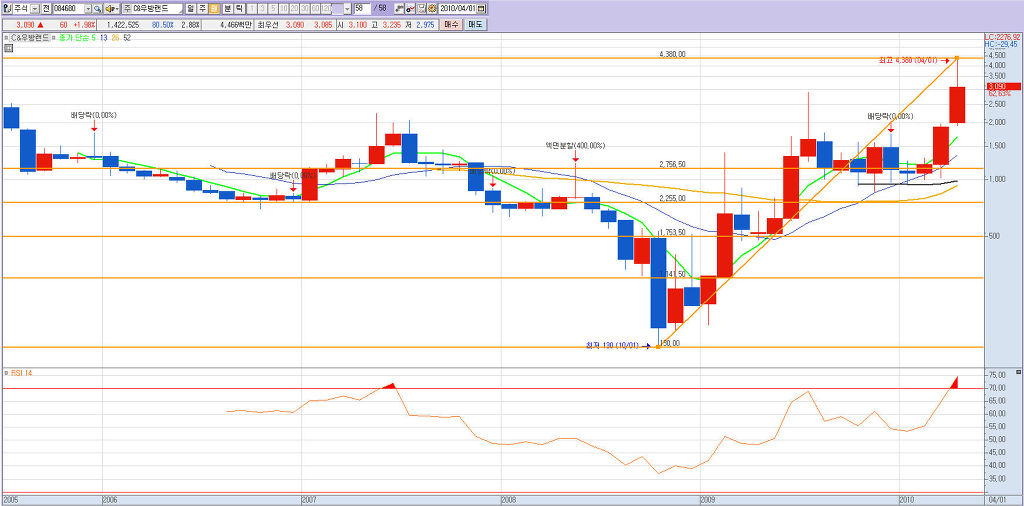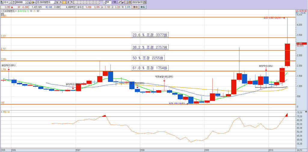 이것은 키움증권에서 제공하는 피보나치 조정대 입니다. 23.6수치를 23.8로 표시해서 잘못 표시되었을뿐아니라 밑에서 23.6 수치가 아니라 조정을 받는 값이니 밑에서는 76.4조정받는곳을 표시해야 합니다. 그렇다면 정상대로 표시되었을때 어떻게 되는지 보시죠