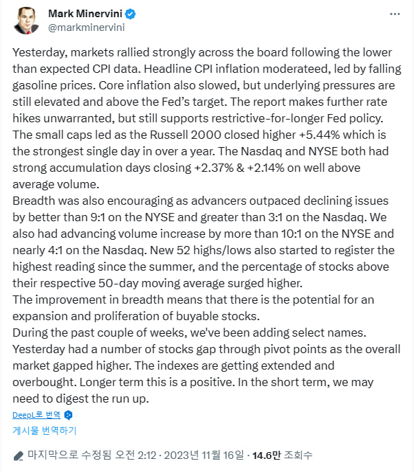 지난 몇 주 동안 일부 종목을 추가했습니다. 어제는 전체 시장이 상승하면서 피벗 포인트를 통과하는 종목이 많았습니다. 지수가 확장되고 과매수되고 있습니다. 장기적으로 이는 긍정적입니다. 단기적으로는 상승분을 소화해야 할 수도 있습니다.