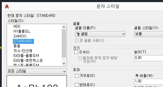 글씨가 이상하게 0.0000000 등으로 나올경우 문자스타일중 Standard 를 수정해야함