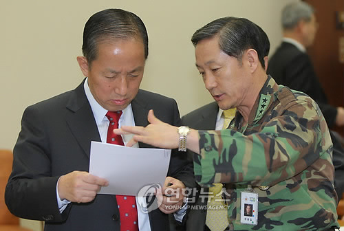 ▲ 김태영 국방부장관이 29일 오후 국회에서 열린 국방위원회에서 장광일 국방정책실장과 `철책 절단 월북' 등 보고자료를 검토하고 있다.